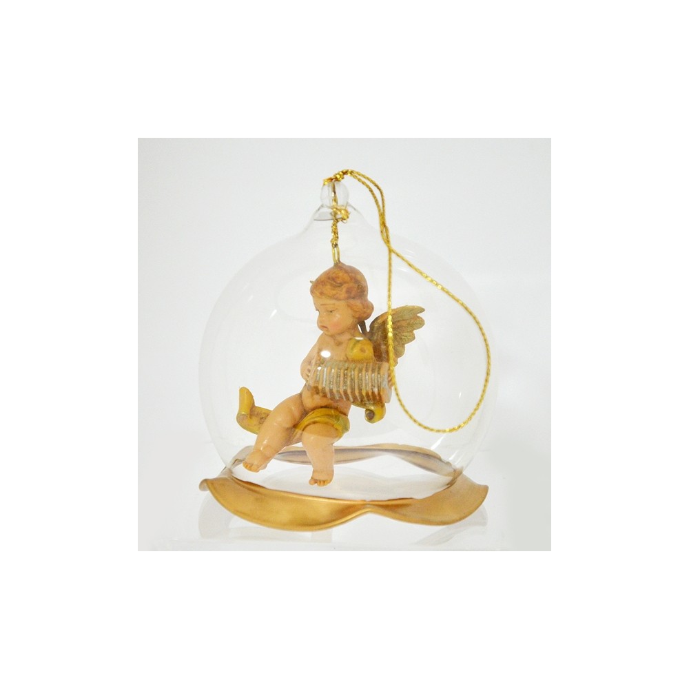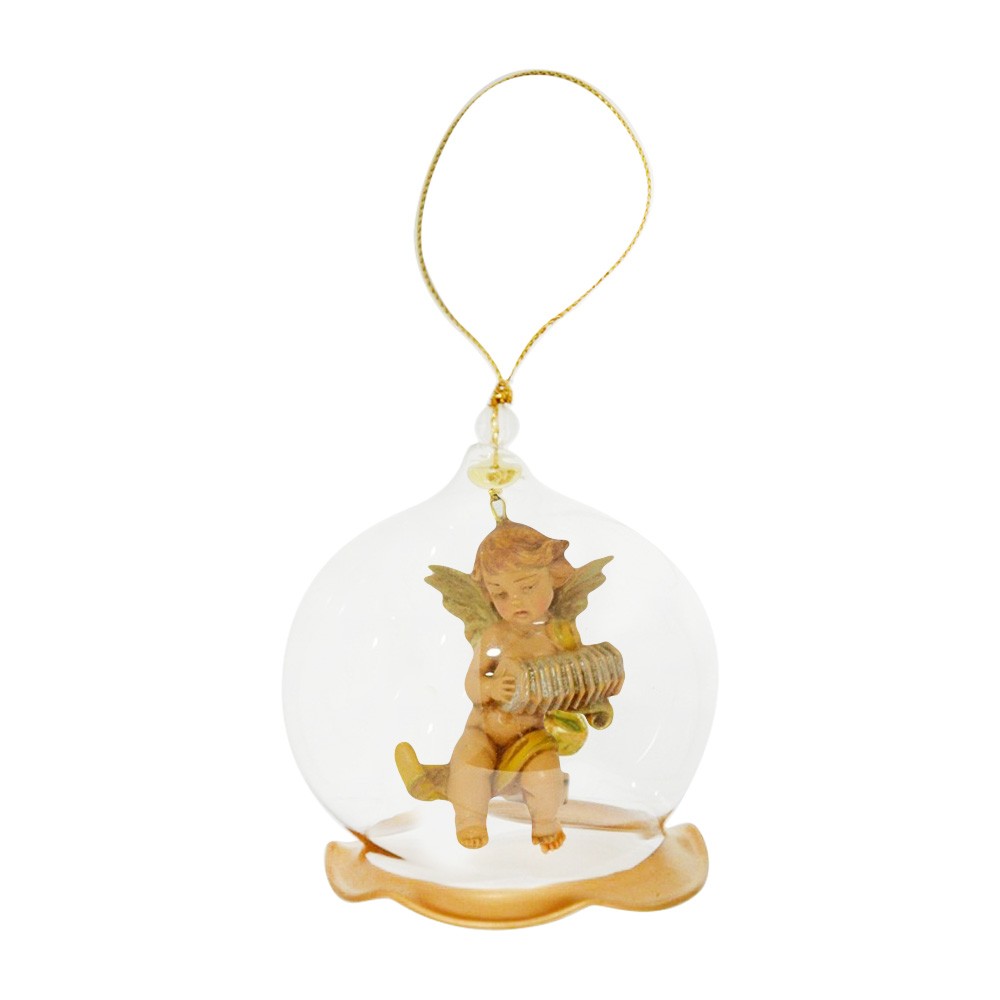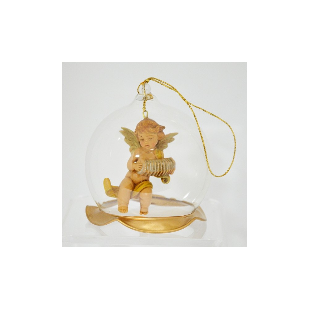 Campana in vetro soffiato da appendere con Angelo musicante. Ornamento corredato da scatola litografata.