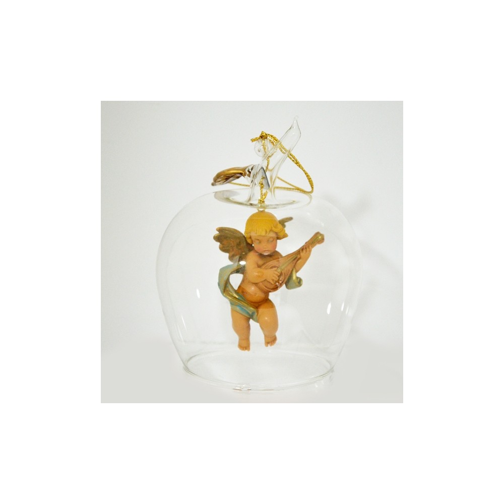 Campana in vetro soffiato da appendere con Angelo musicante. Ornamento corredato da scatola litografata.