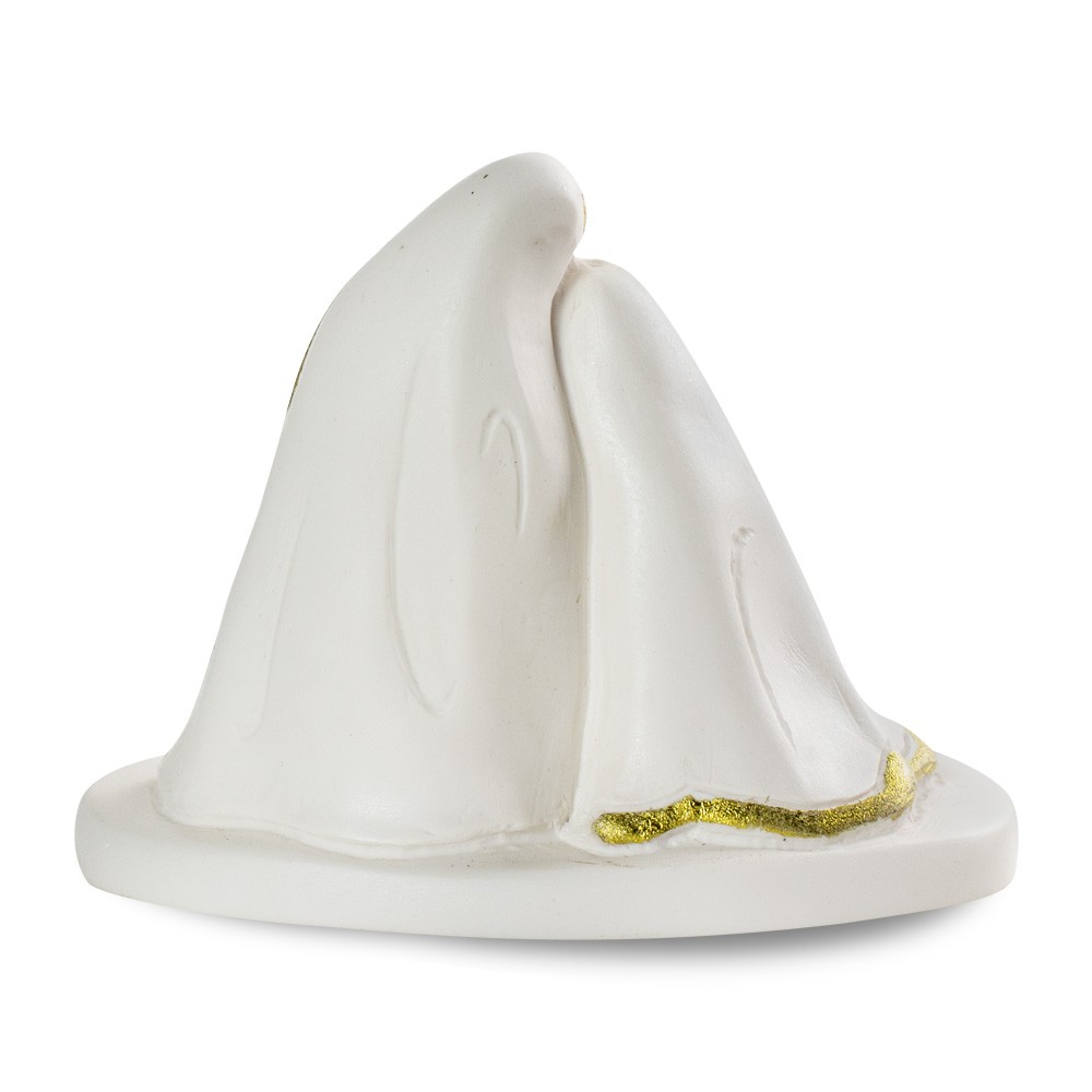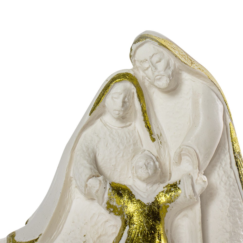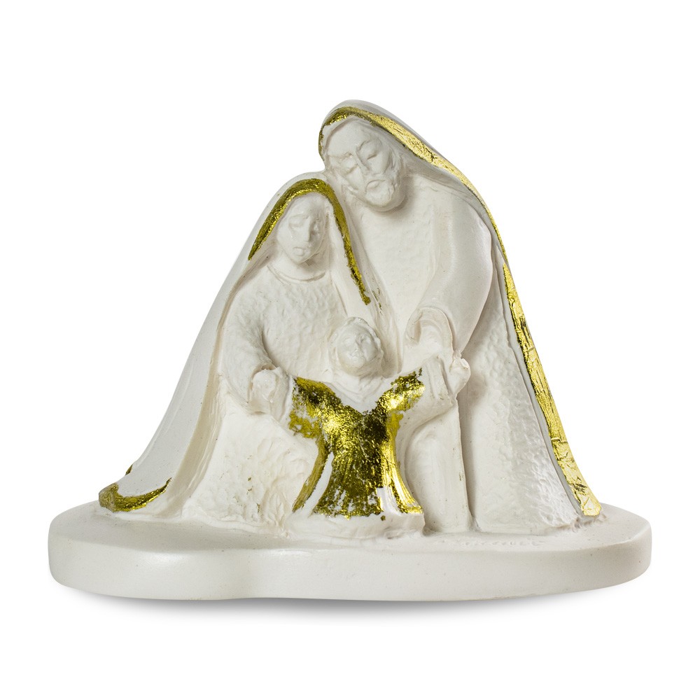 Questa bellissima sacra famiglia è interamente in resina bianca con inserti in oro, è alta 6 cm.
