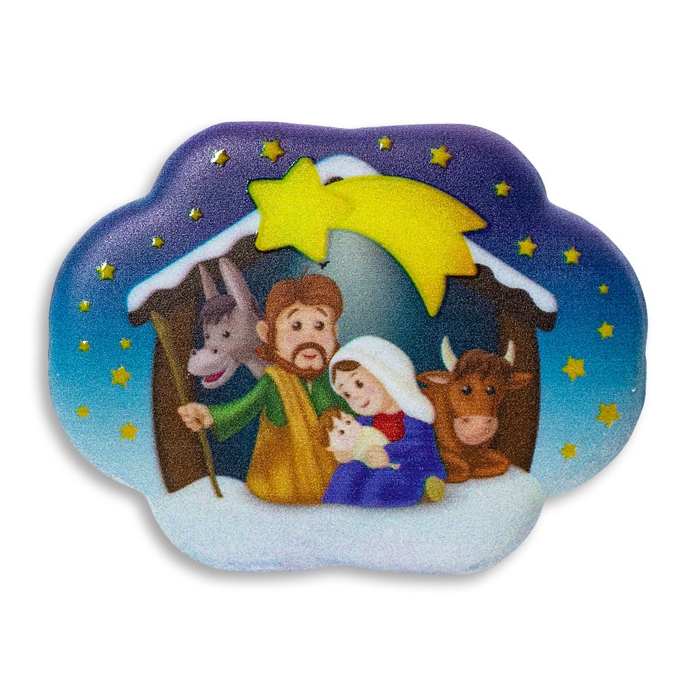 Realizzato in polimero con decoro natività in rilievo, dimensioni 6x6 cm.