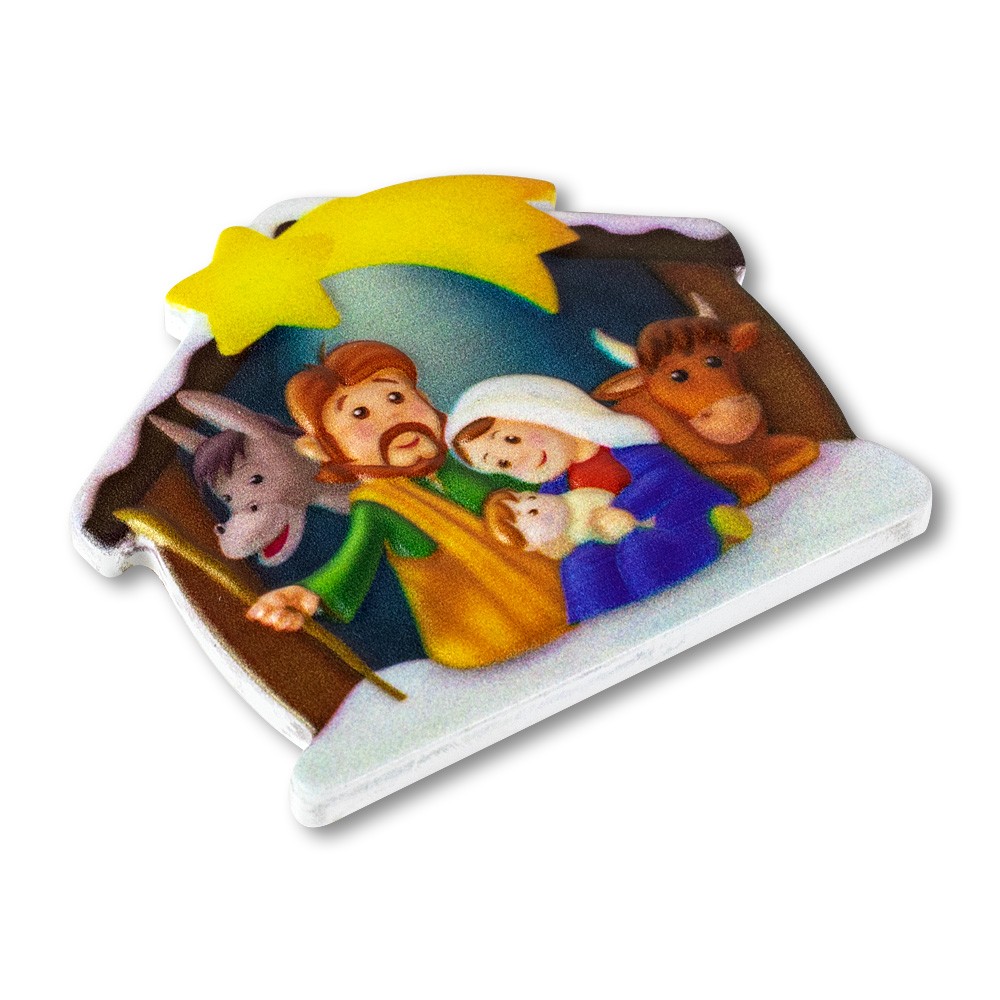 Magnete natalizio adatto per bambini con immagine raffigurata della capanna con natività.