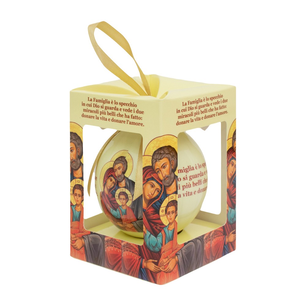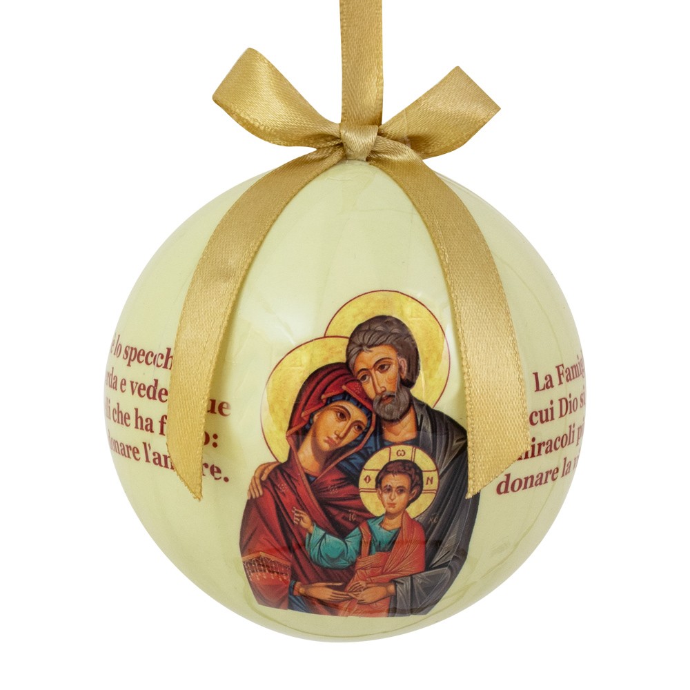 Sulla palla di natale è raffigurata una Sacra Famiglia con frase.