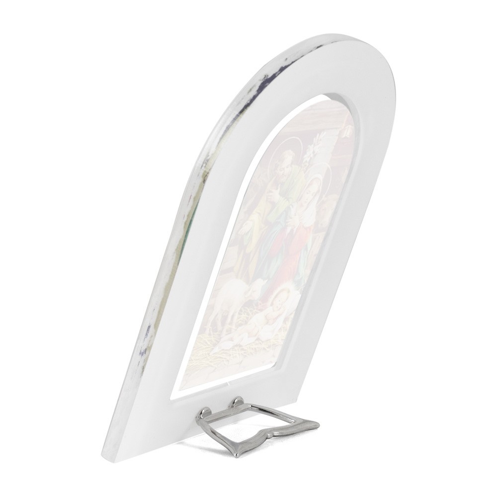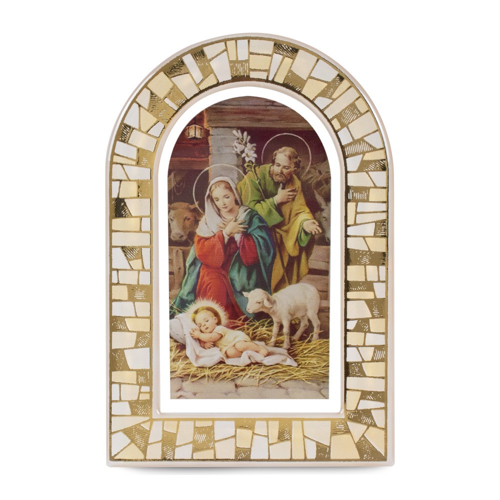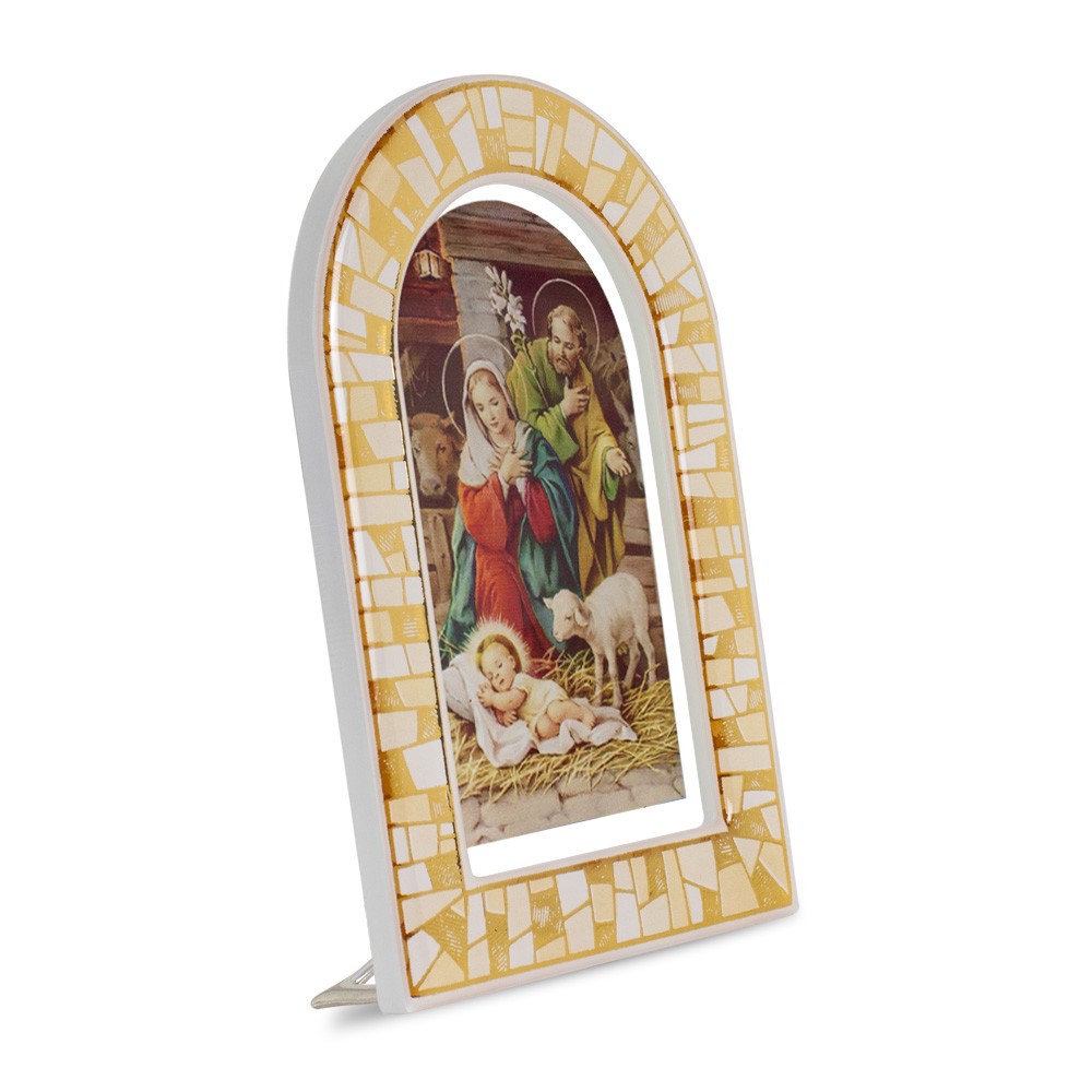 Il quadretto è in plexiglass con effetti tridimensionali e dettagli in oro a caldo. Sul quadretto è raffigurata una natività riprodotta su vetrata. Dotato di piedino in metallo argento per poterlo appoggiare.
