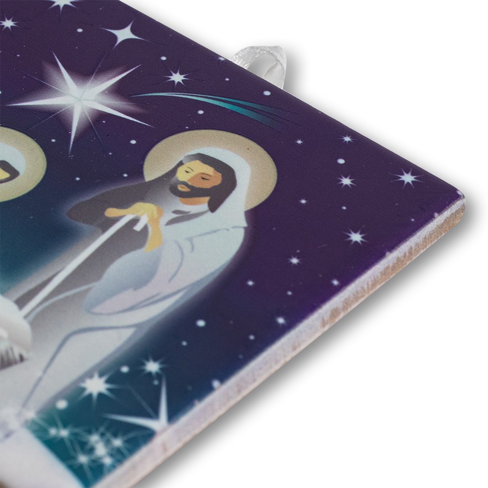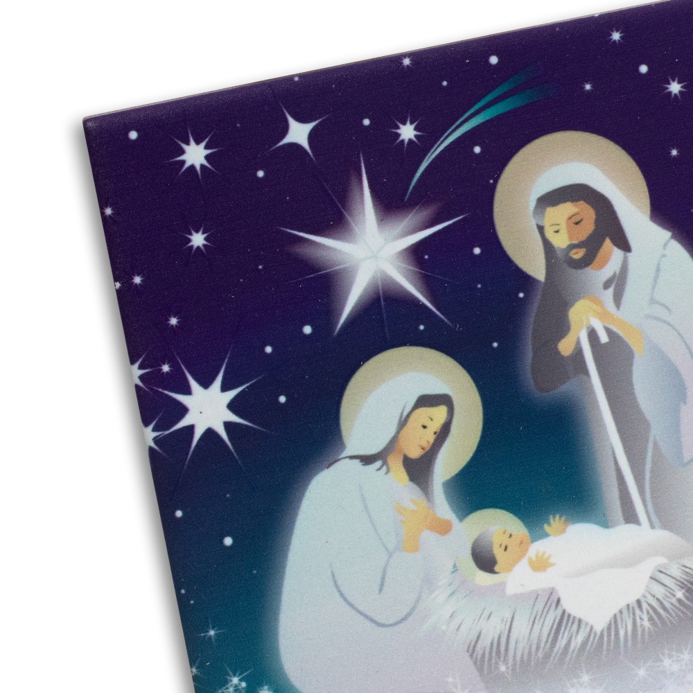 Regali di natale: piastrella natalizia con natività decorata.