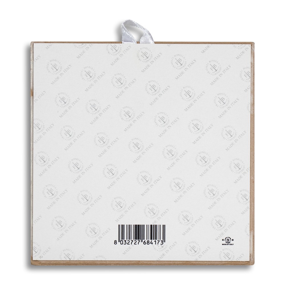 Piastrella natalizia realizzata in ceramica, corredata di nastrino bianco in raso.