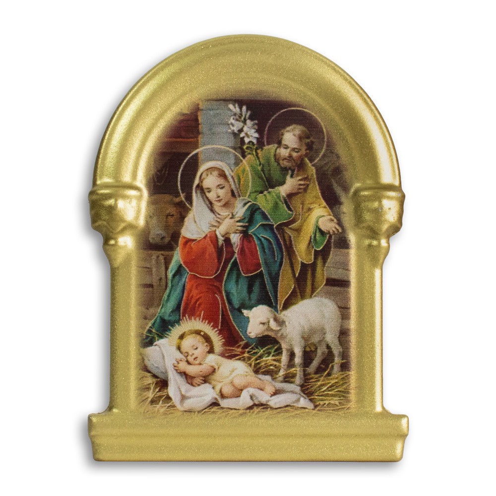 Magnete Natività classica dal tema natalizio con cornice dorata.