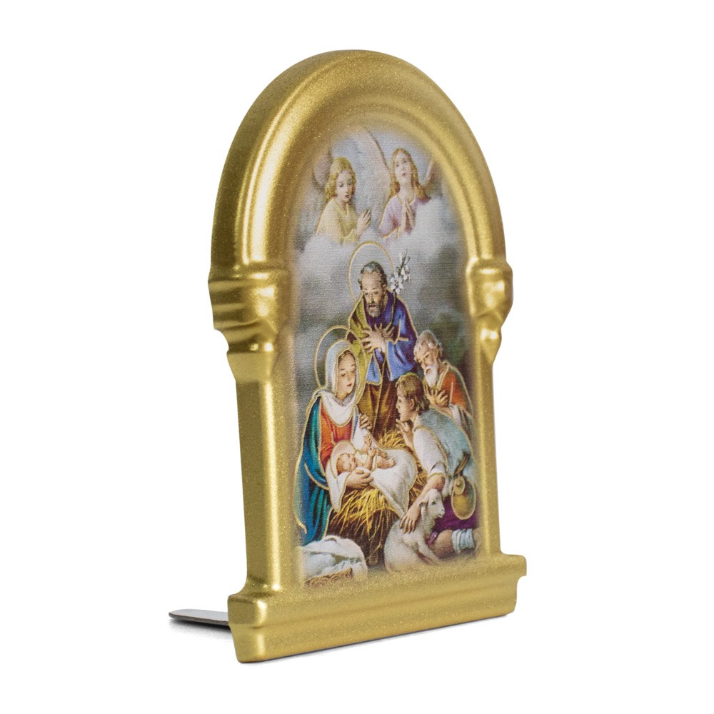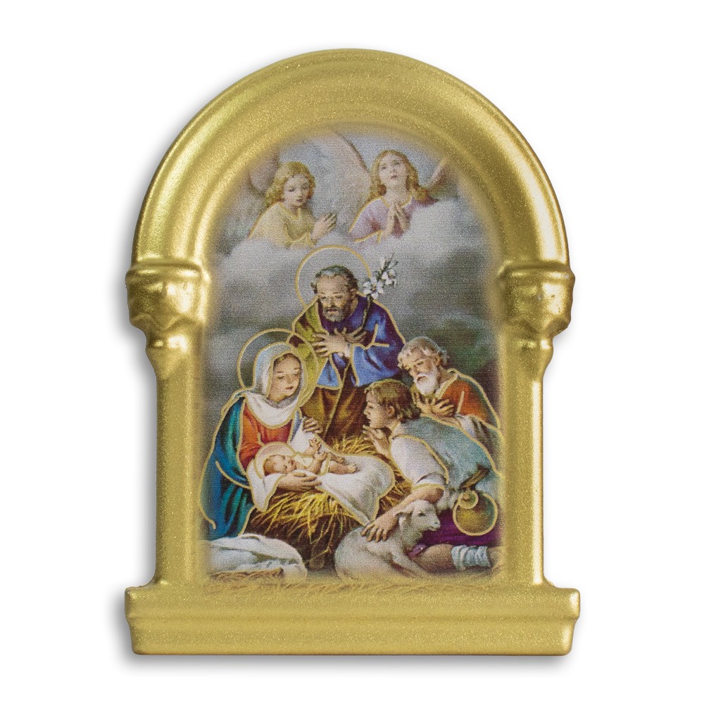 Magnete Natività classica dal tema natalizio con cornice dorata.