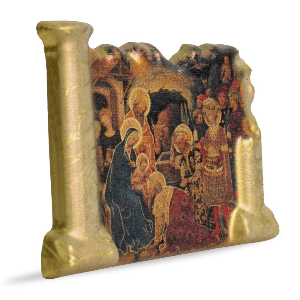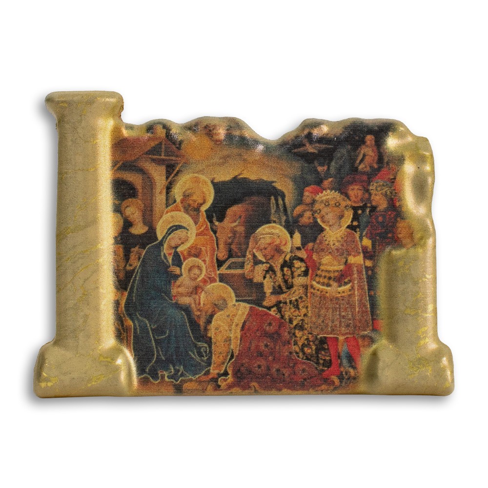 Magnete Natività classica dal tema natalizio con cornice dorata.