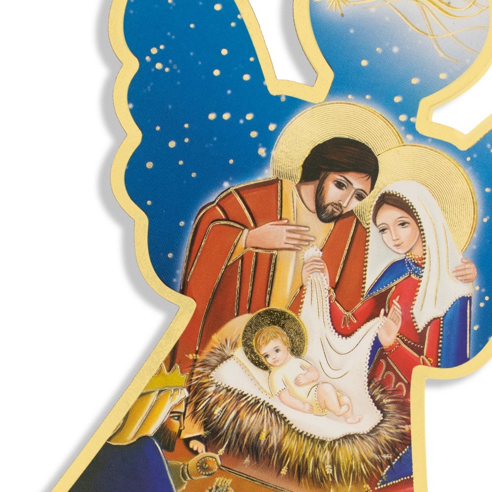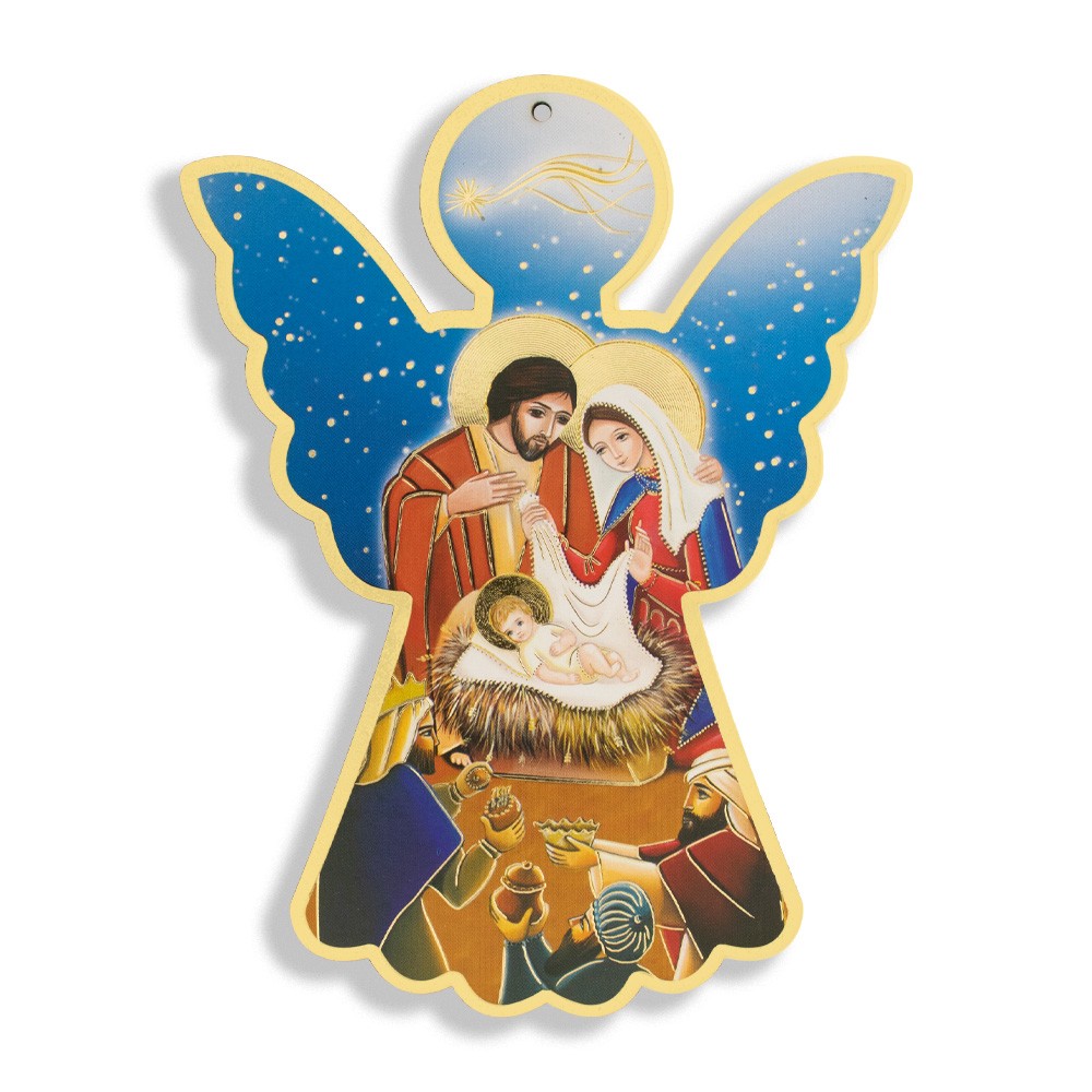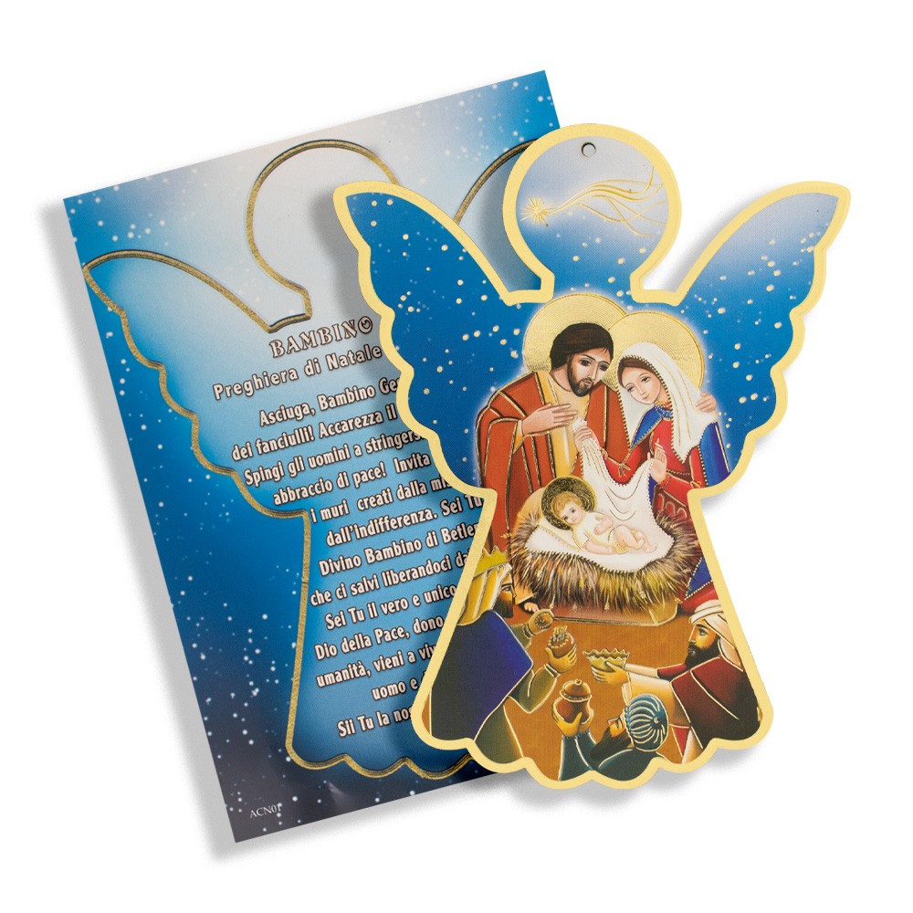 L'angioletto è interamente in legno con immagine stampata della Natività, e foro per essere appeso.