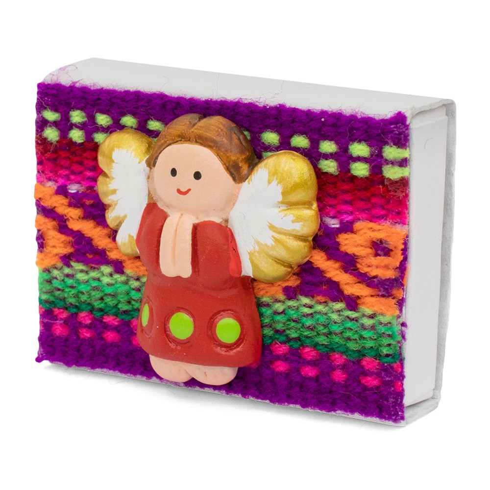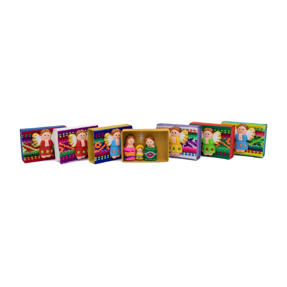 Mini presepe etnico in terracotta realizzato in scatola di fiammiferi con natività all'interno.
