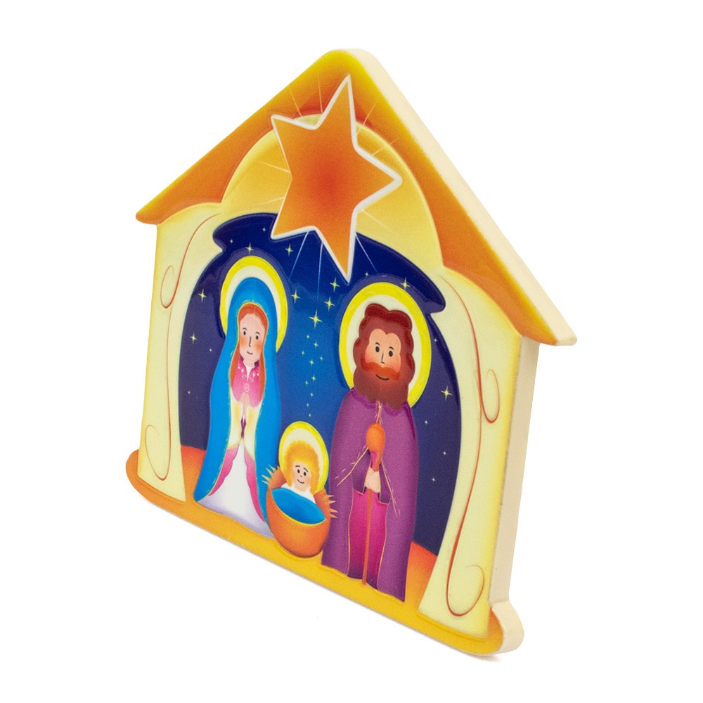 Realizzato in polimero con sagoma della Sacra Famiglia, dimensioni 11,5x10 cm.