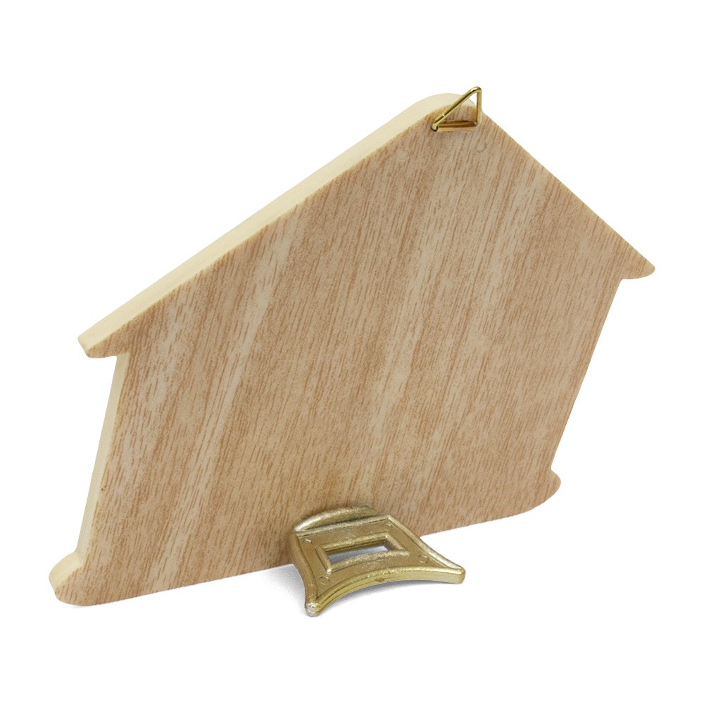 Completo sia di triangolino per poterlo appendere che di supporto per essere adagiato su una superficie.