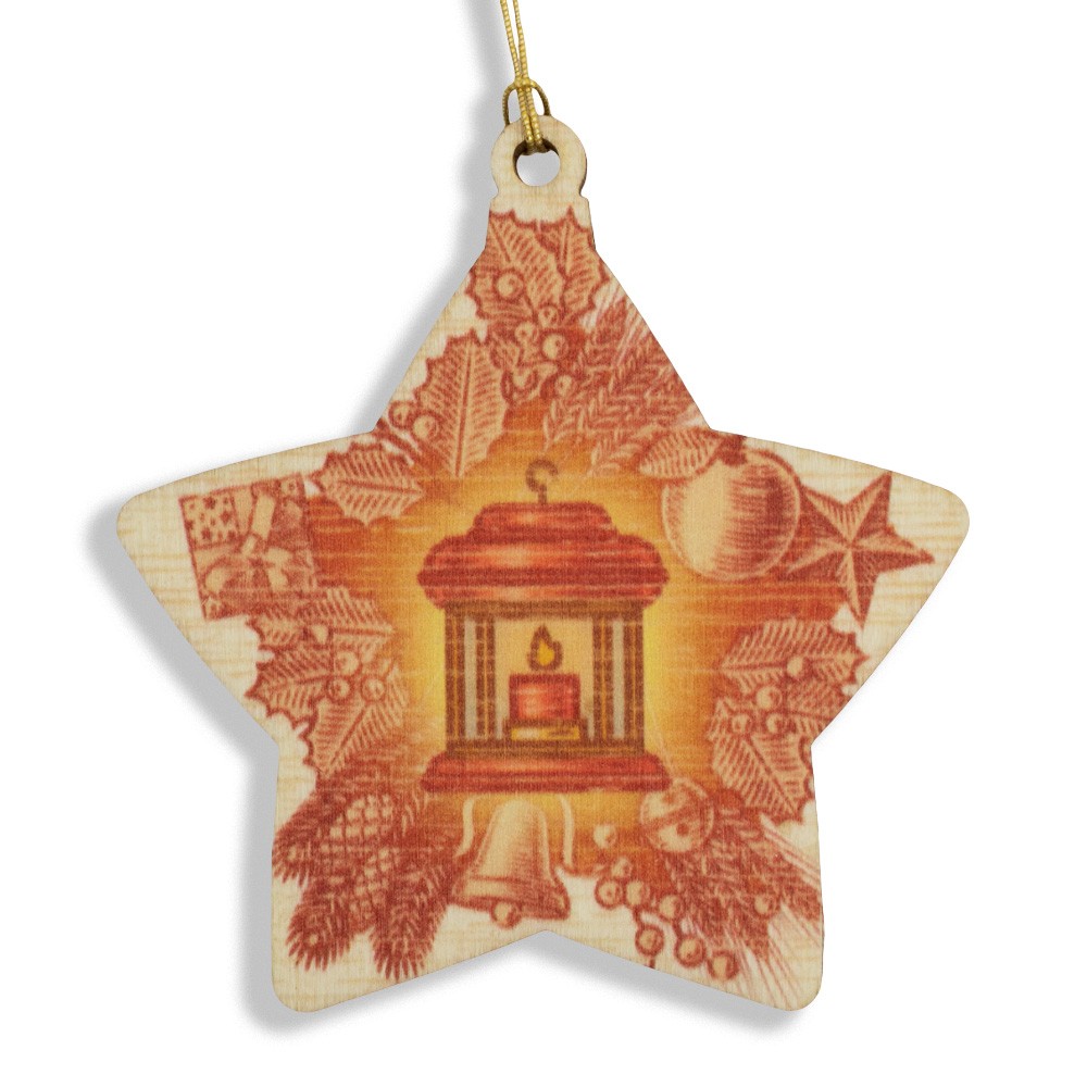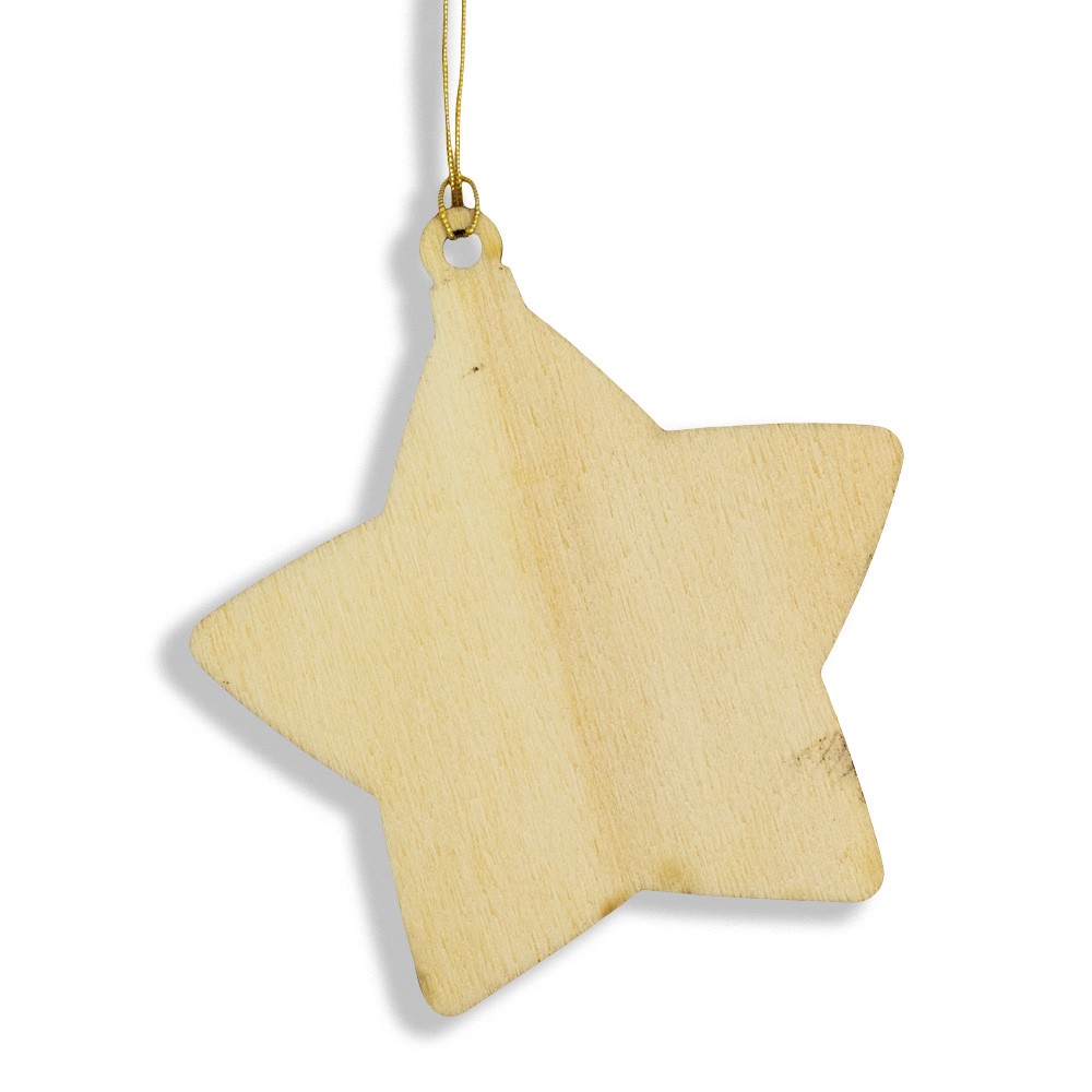 La stella è in legno di pioppo sbiancato, con stampa direttamente sul legno con toni caldi, creando un carinissimo effetto rustico.
