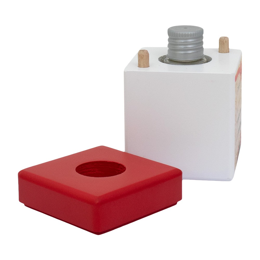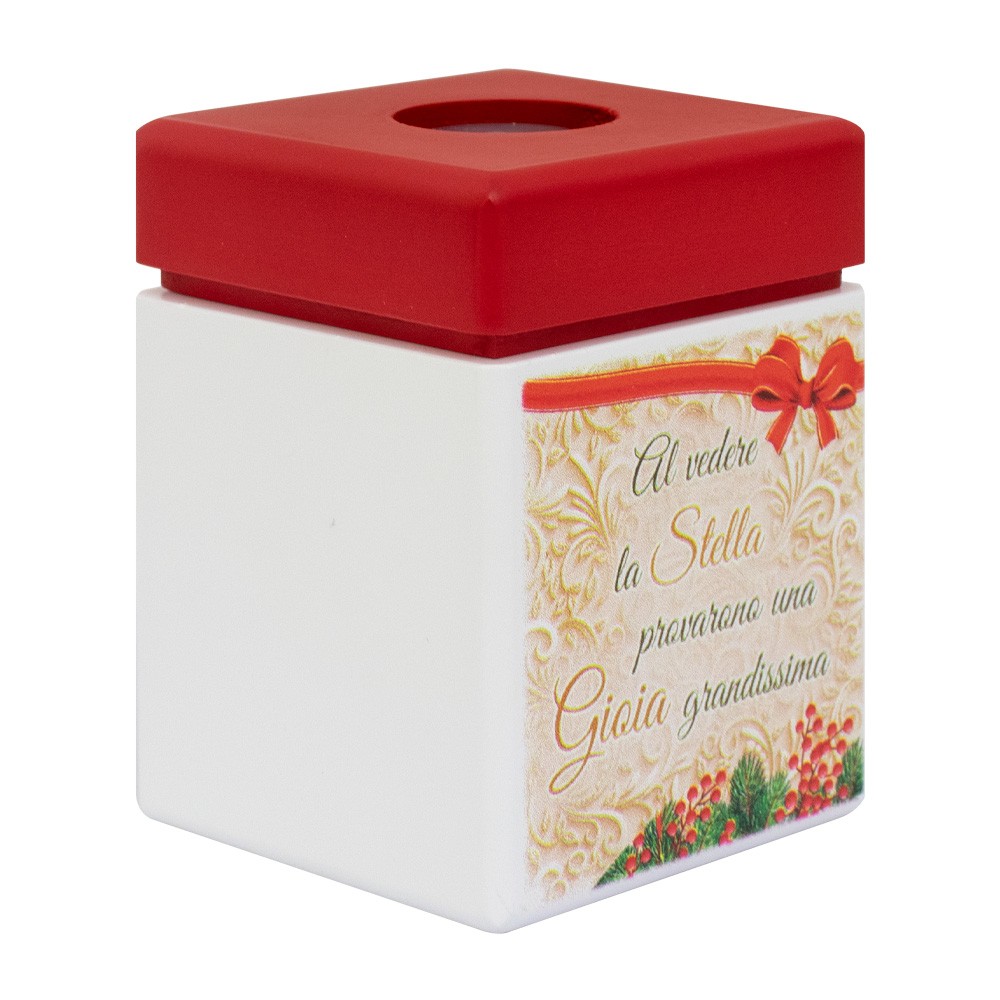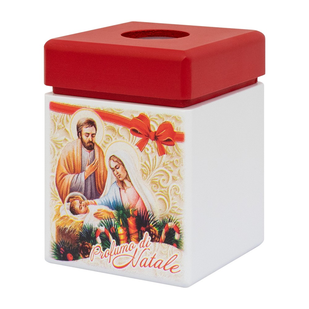 Il diffusore è in legno bianco e rosso, con immagine della Natività e frase " Al vedere la Stella provarono una Gioia grandissima".