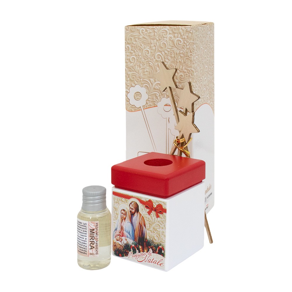 All'interno del diffusore vi è il profumo all'essenza Mirra con tre bacchette in legno, corredato di scatola regalo decorata.