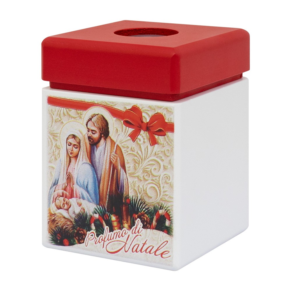 Il diffusore è in legno bianco e rosso, con immagine della Natività e frase " Al vedere la Stella provarono una Gioia grandissima".