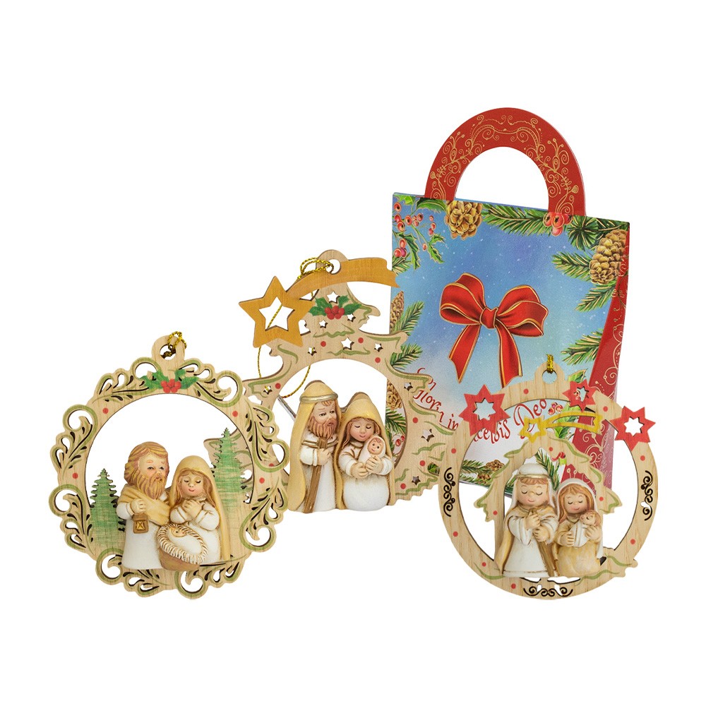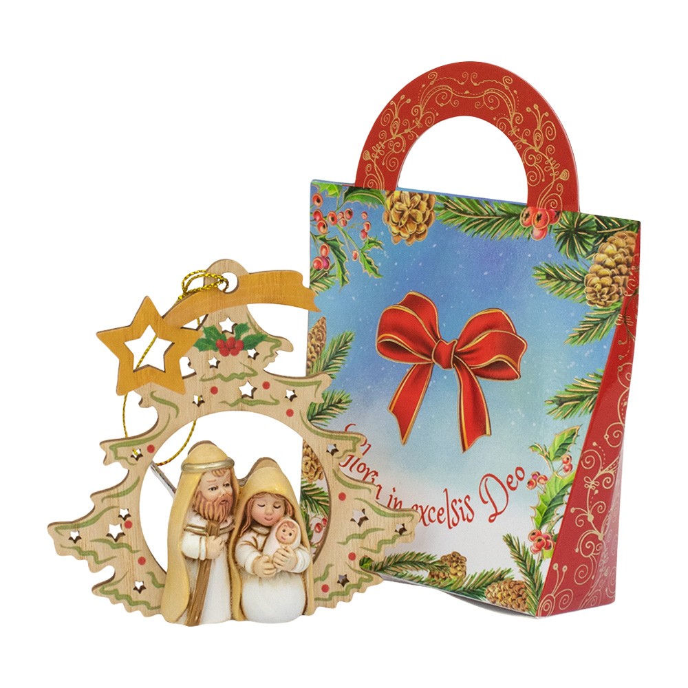 Decorazione natalizie per albero realizzata in legno con graziosi decori traforati e natività in rilievo.