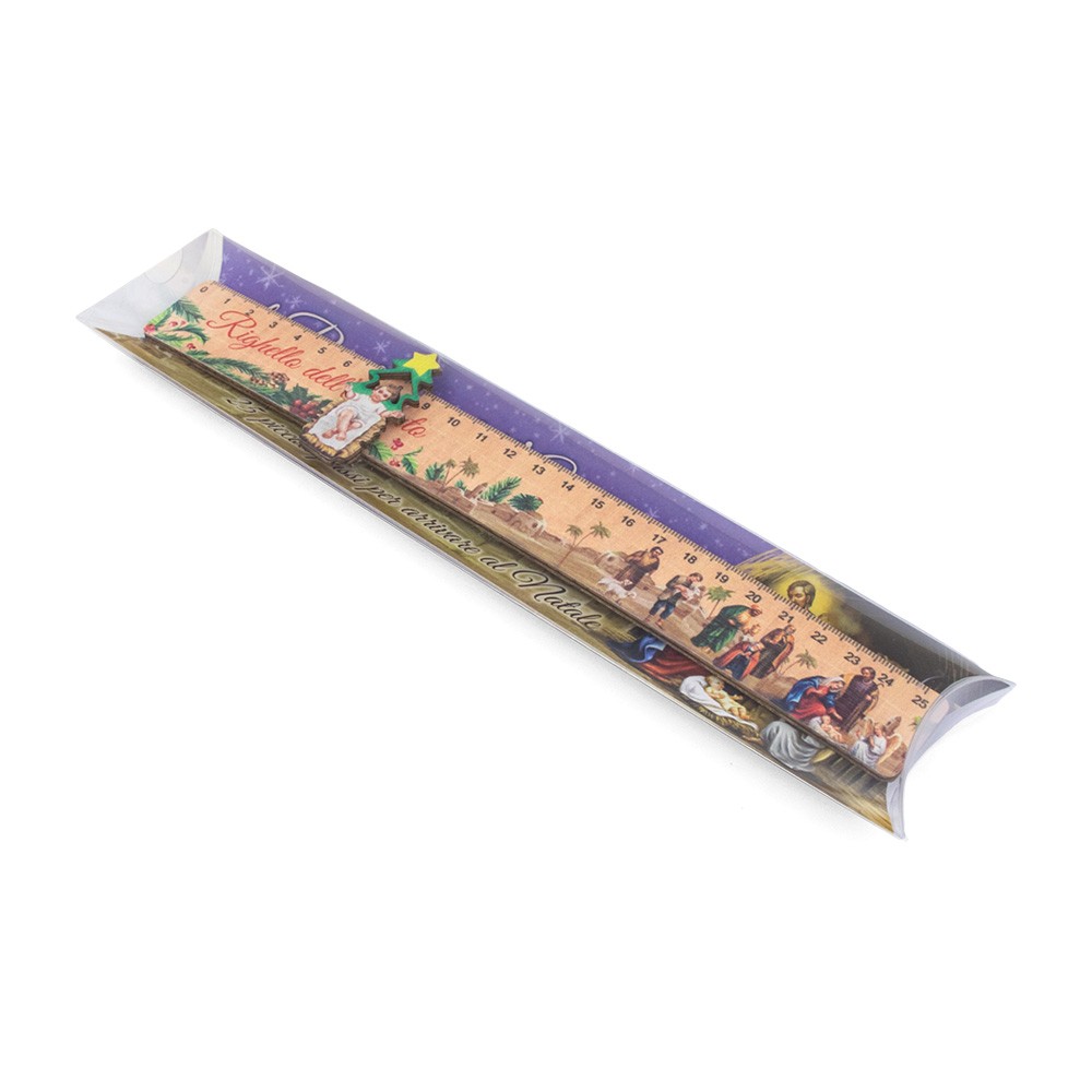 Il righello è confezionato in scatola di plastica trasparente assieme ad un cartoncino decorato.