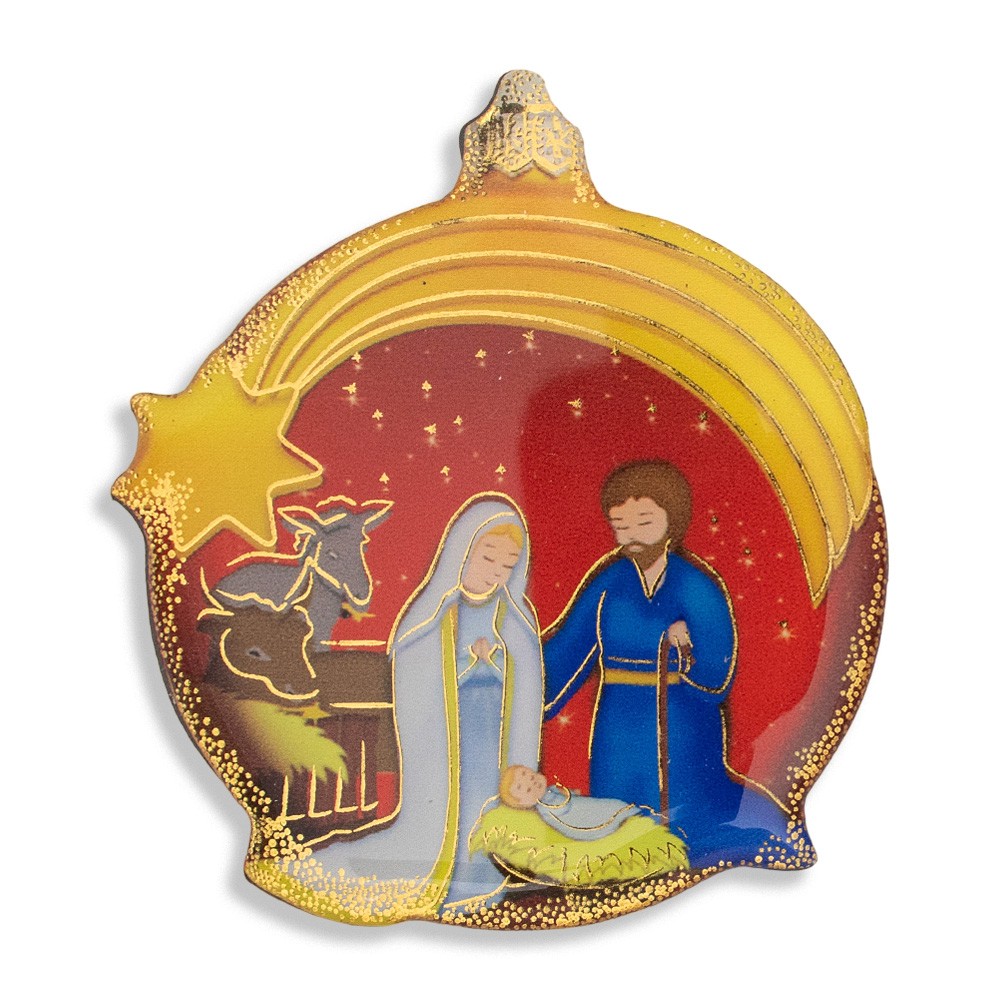 Magnete tondo a forma di pallina natalizia con immagine della natività stampata.