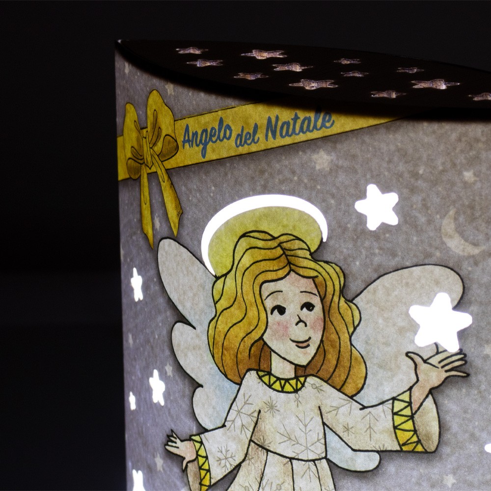 Ogni lampada è finemente decorata con immagini, inserti traforati e scritta "Angelo del Natale", può essere sia appesa che d'appoggio.