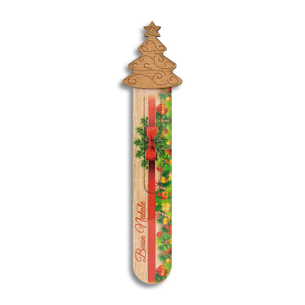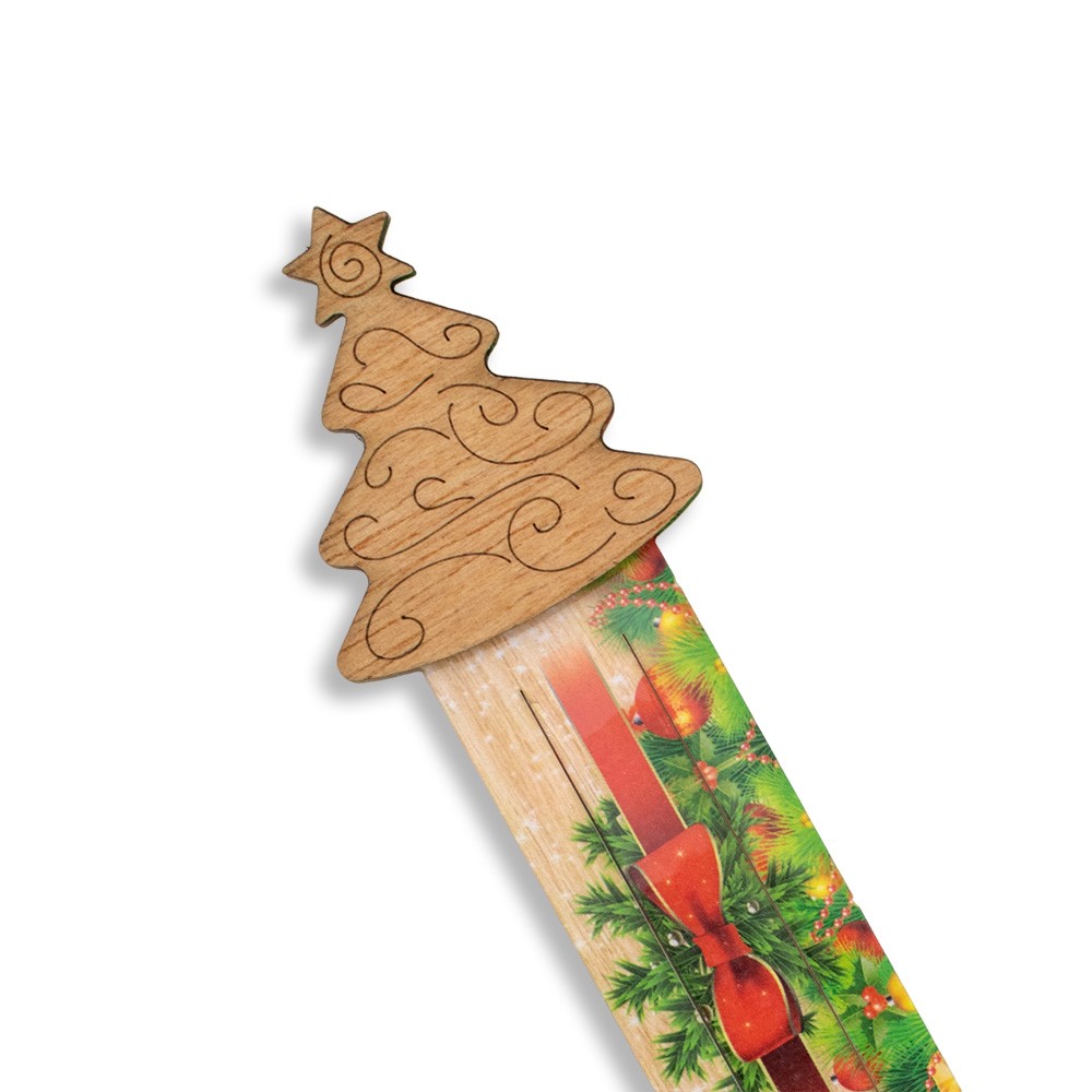 Segnalibro plastificato e decorato con sagoma in legno MDF di un alberello di natale.