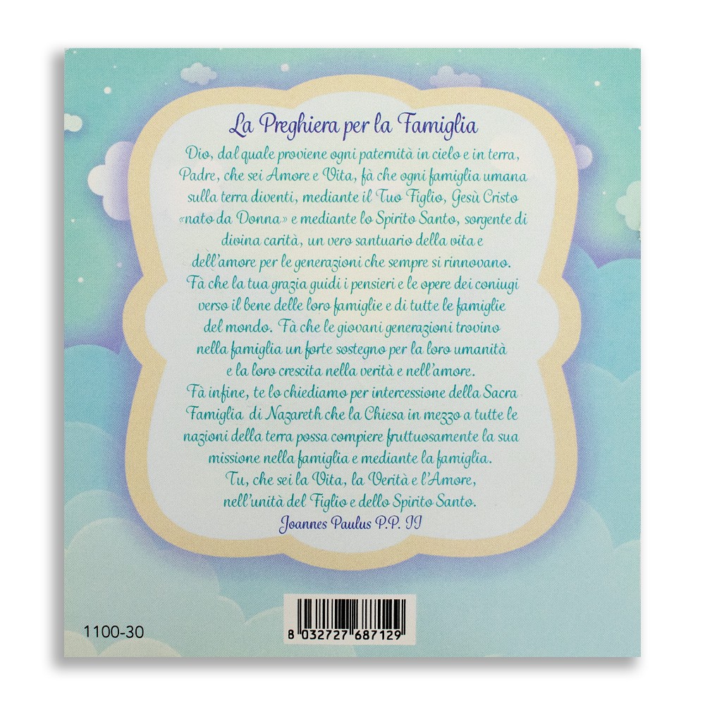 Viene fornito imbustato singolarmente con cartoncino decorato e preghiera stampata per la Famiglia.