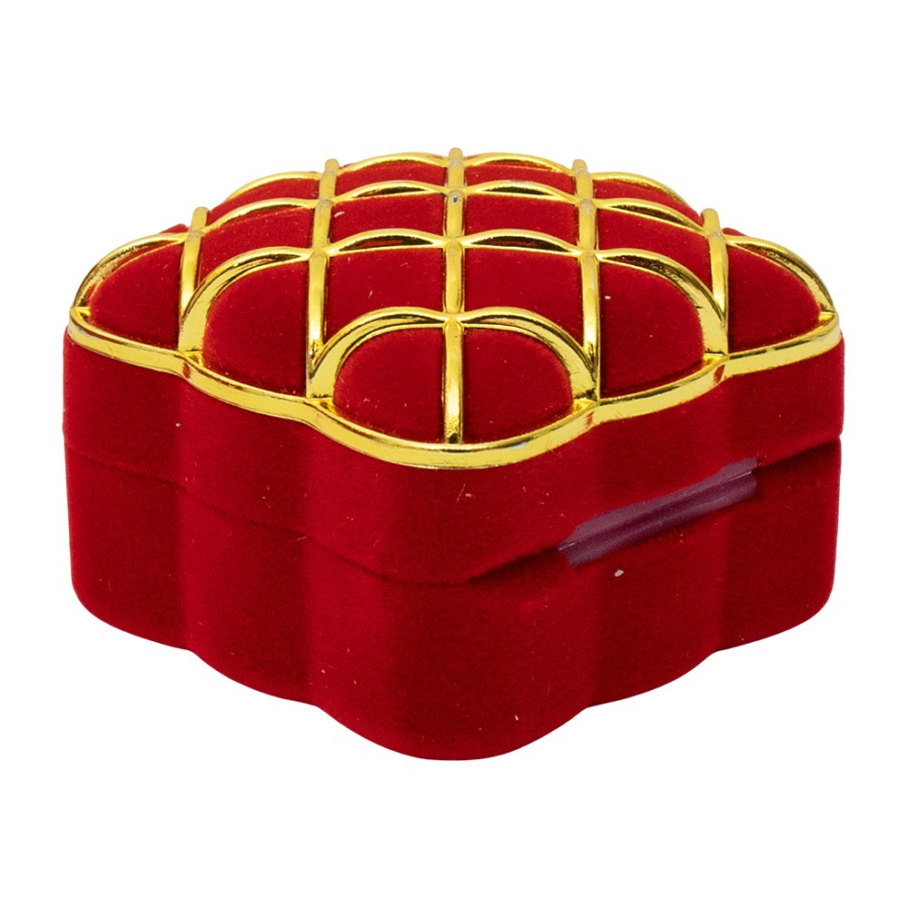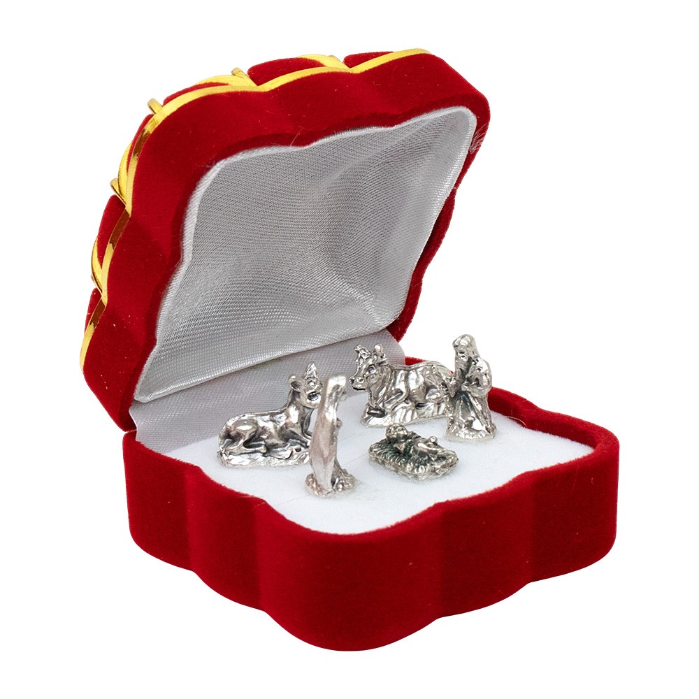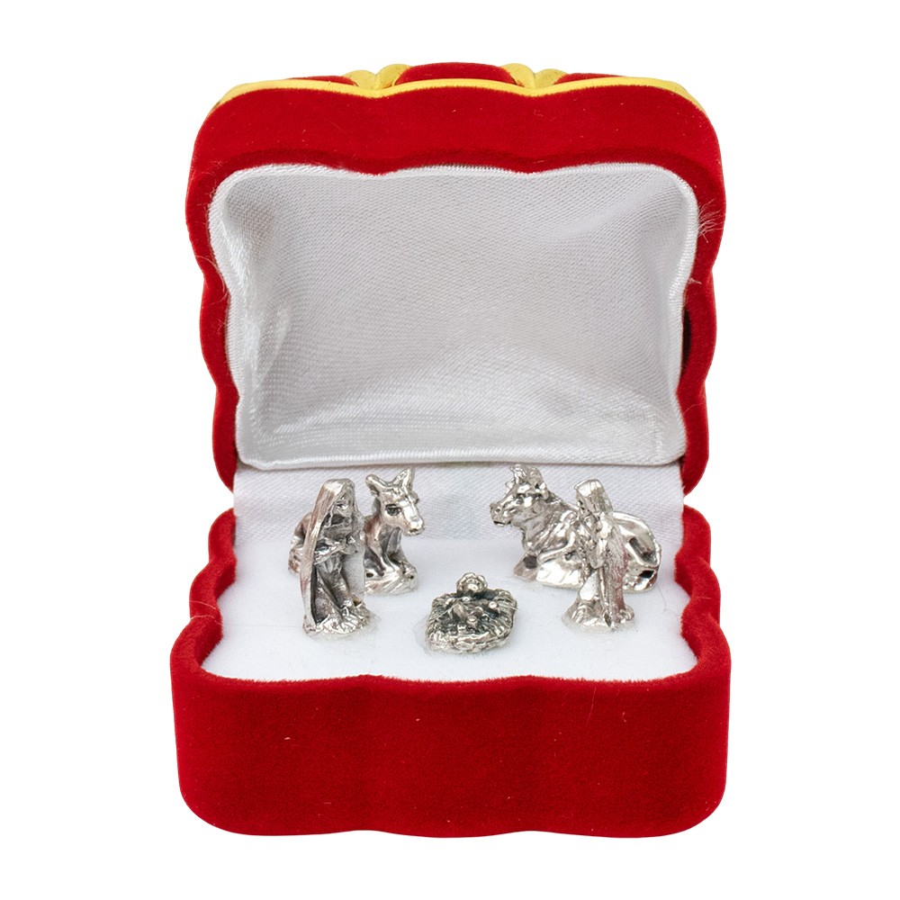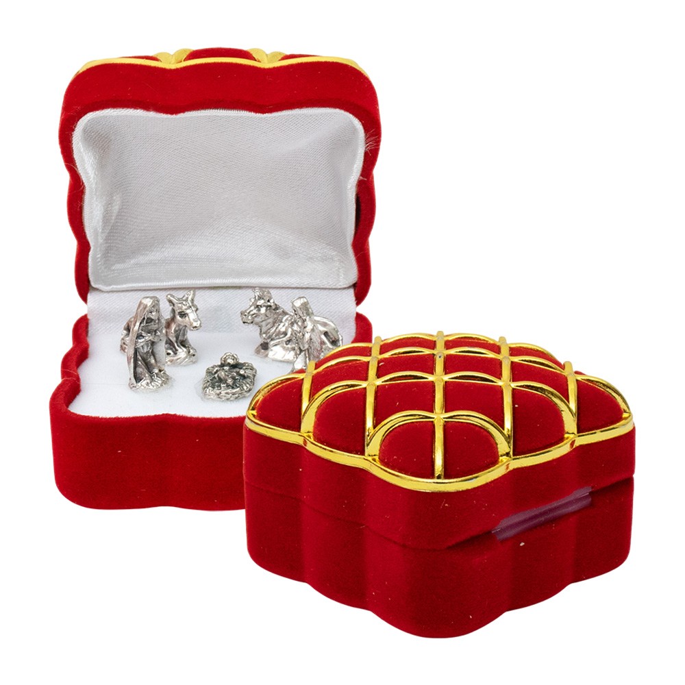 Mini cofanetto natalizio in velluto a forma quadrata con all'interno una natività in metallo.