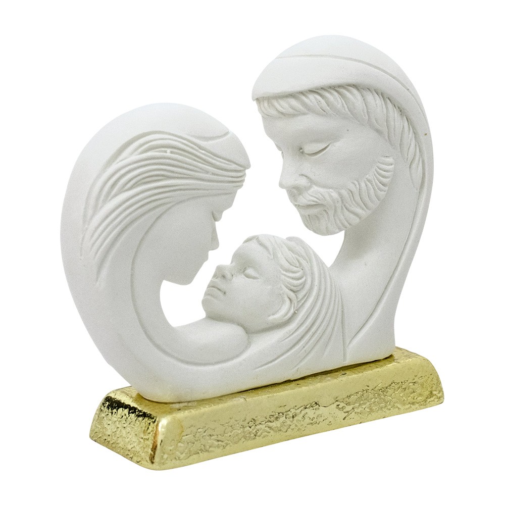 Statuetta dela Sacra famiglia in resina bianca con base dorata.