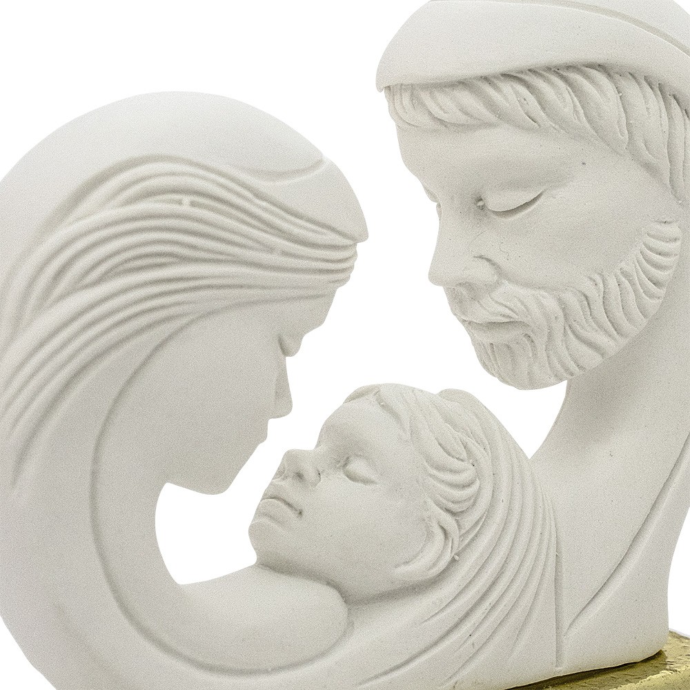 Sacra famiglia in resina bianca con base dorata, dimensioni 8x7 cm.
