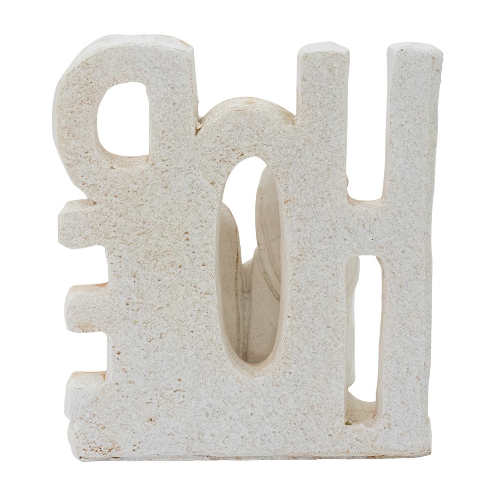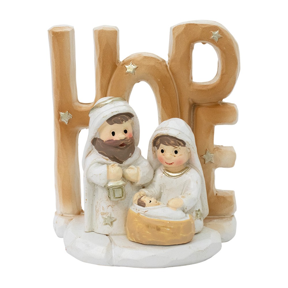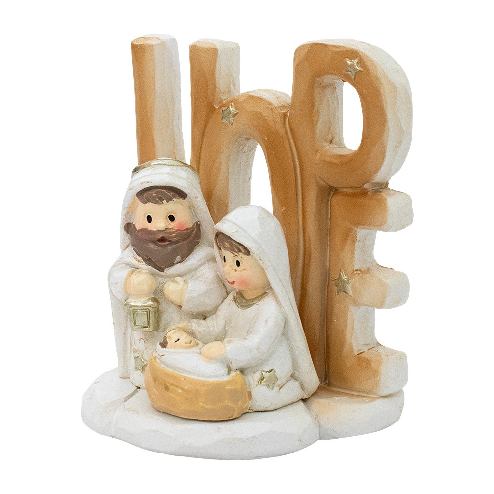 Mini Natività con base e scritta HOPE, realizzata interamente in resina e dipinta a mano con cura.