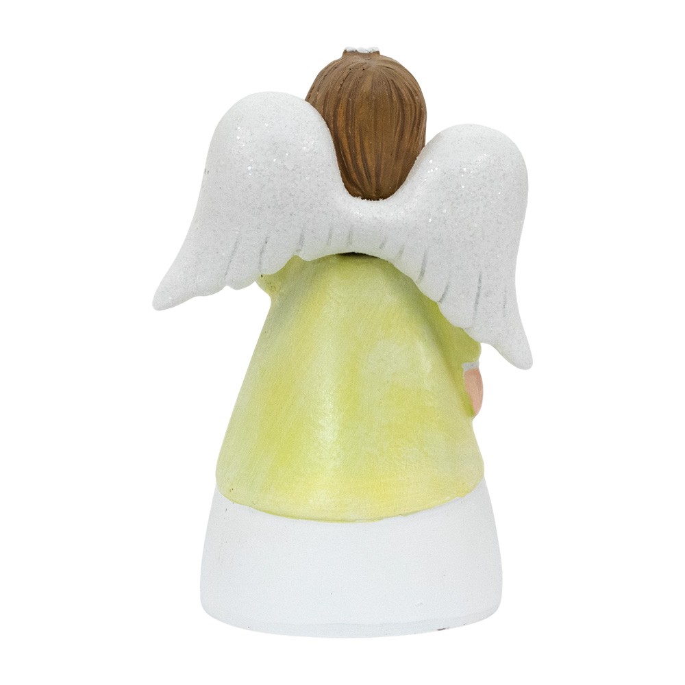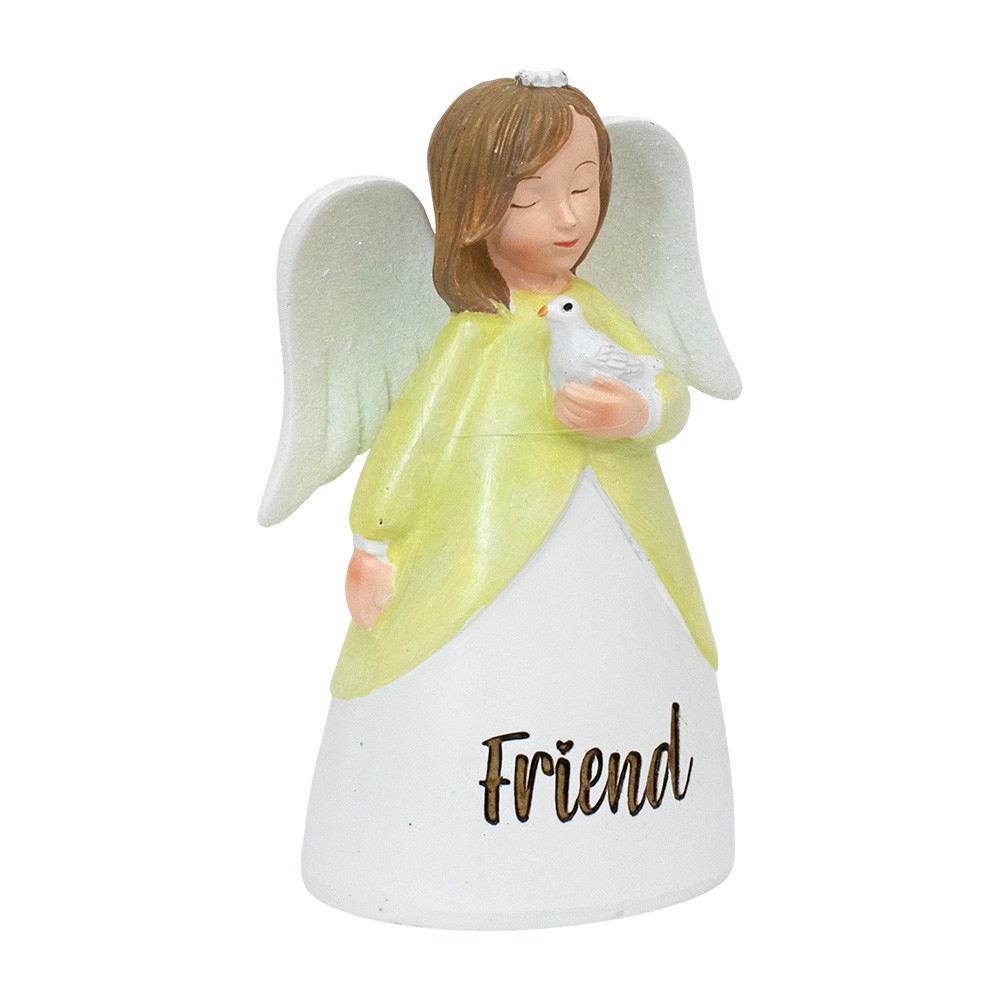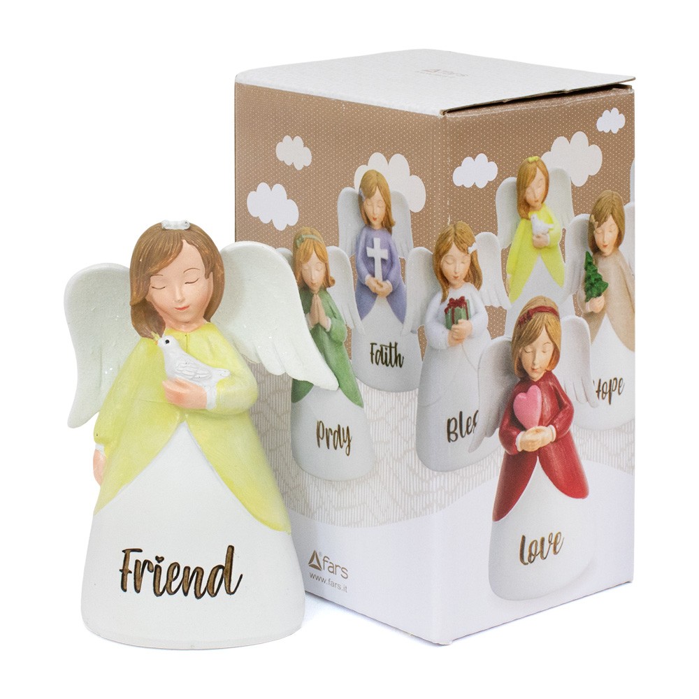 Carinissima statuetta Angelo in resina dipinto a mano, con veste di colore giallo che porta in mano una colomba. L'angioletto riporta la scritta "FRIEND" e misura 11 cm di altezza.