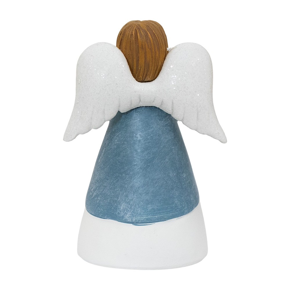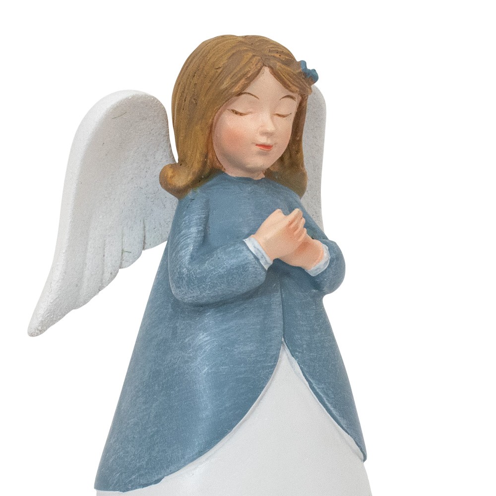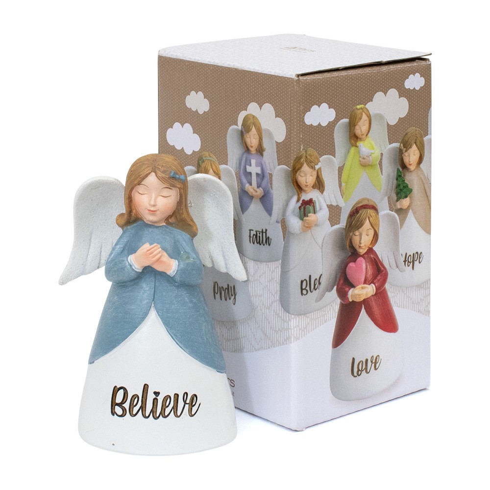 Statua angioletto in resina colorato e dipinto a mano, con veste blu che prega. Riporta la scritta "BELIEVE" e misura 11 cm di altezza.