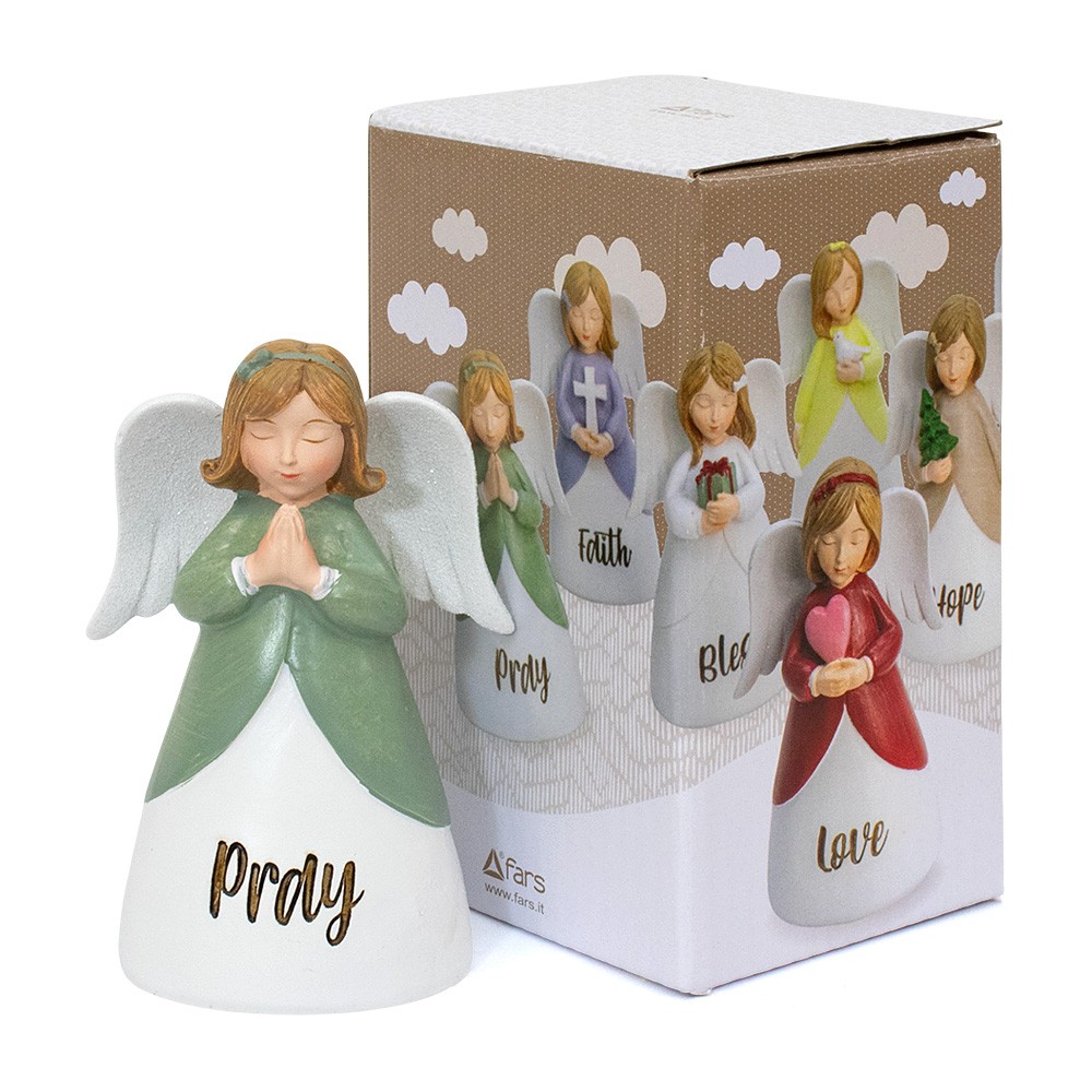 Dolce angioletto in resina dipinto a mano, con veste rosa e aureola tra le mani. Riporta la scritta "Pray" e misura 11 cm di altezza.