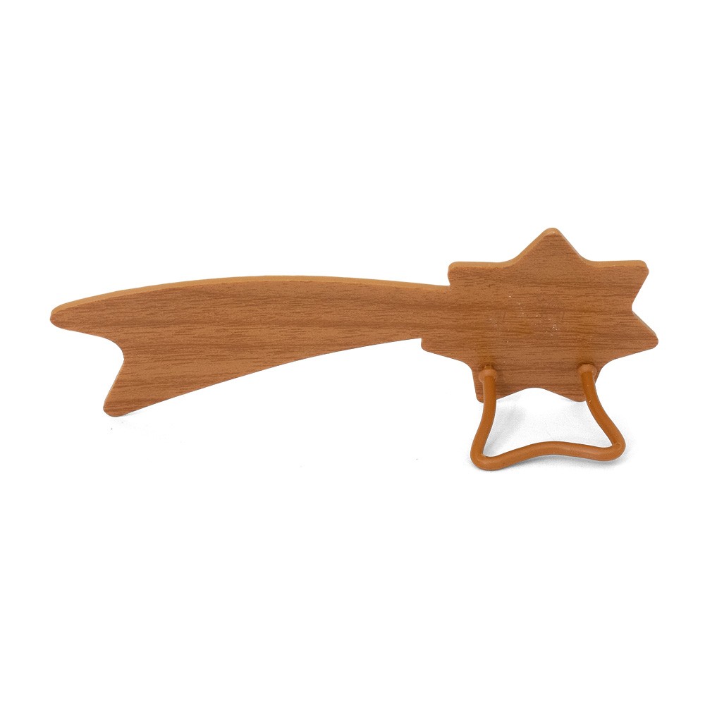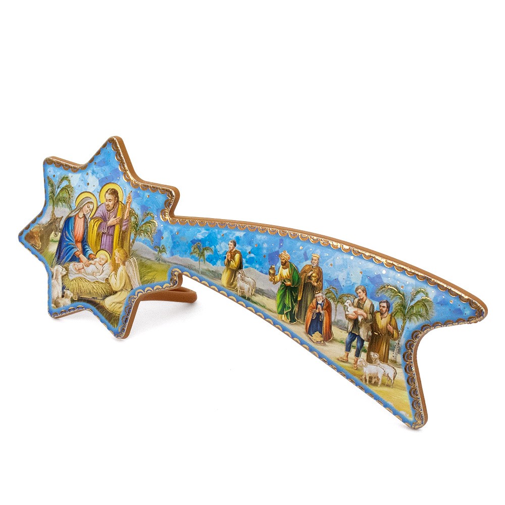 Questa decorazione natalizia a forma di stella cometa presenta la Natività con i re magi e pastori stampati ed è completa di piedino, che permette di esporre facilmente il quadretto su scrivanie, mensole o altari domestici.