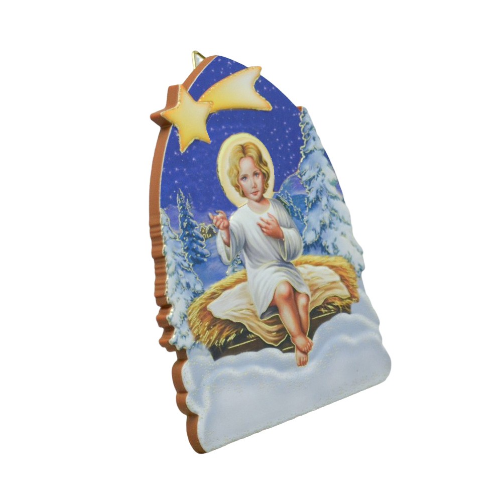 Quadretto in polimero di Gesù Bambino con stella cometa con piedino da appoggio e triangolino da appendere alla parete.