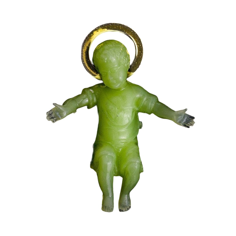 Gesù Bambino in Plastica Fosforescente con Aureola Dorata. Questo Bambinello è ideale per Regalini ai Bambini o per Lavoretti nelle scuole ed al Catechismo.