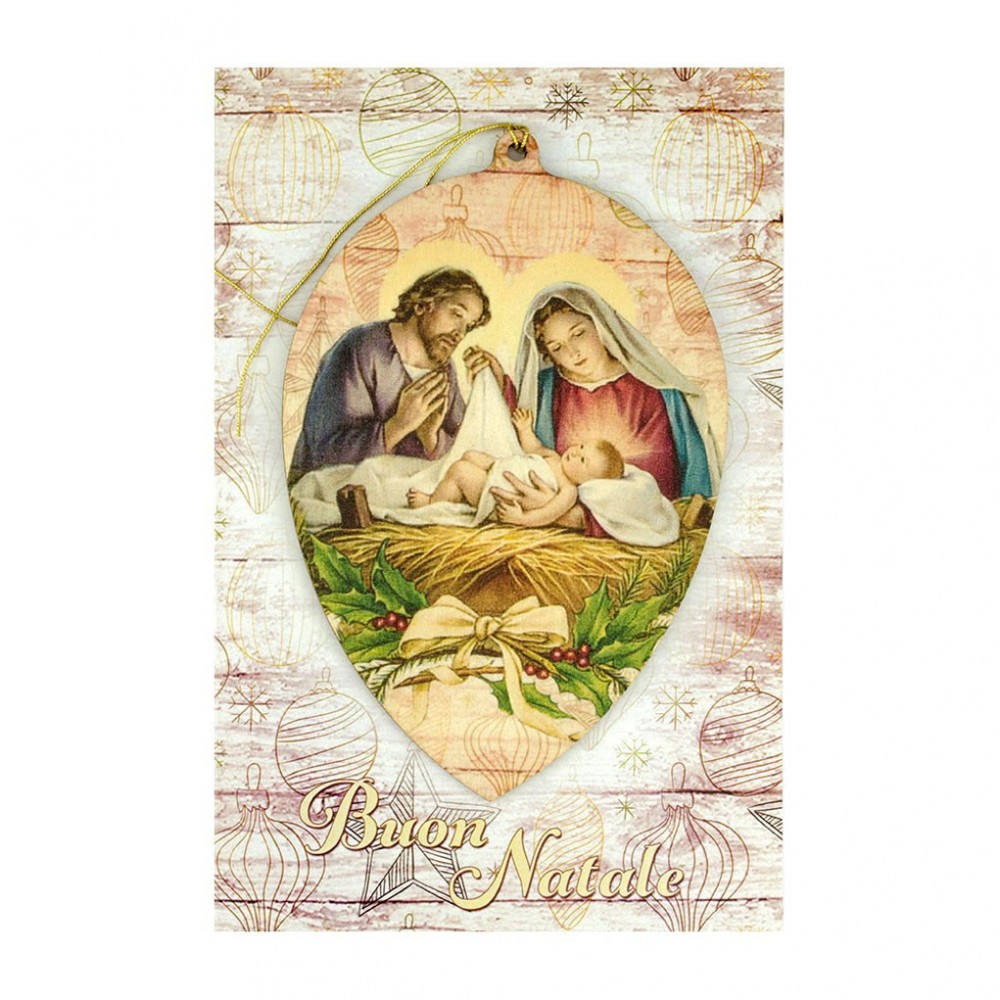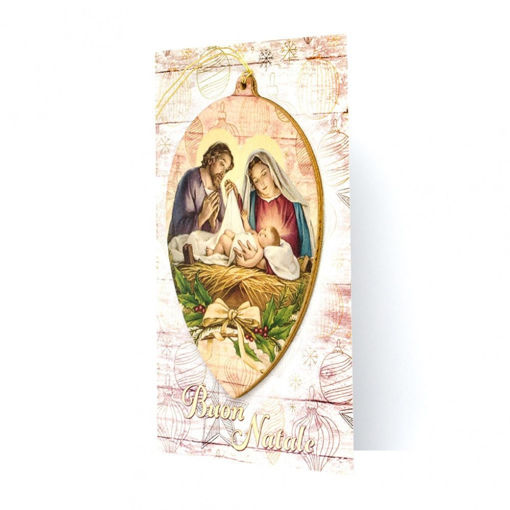 Biglietto augurale Natalizio con decoro in legno. All'interno del bigliettino vi è un grazioso addobbo natalizio da appendere all'albero di natale. Il biglietto viene consegnato con bustina bianca.