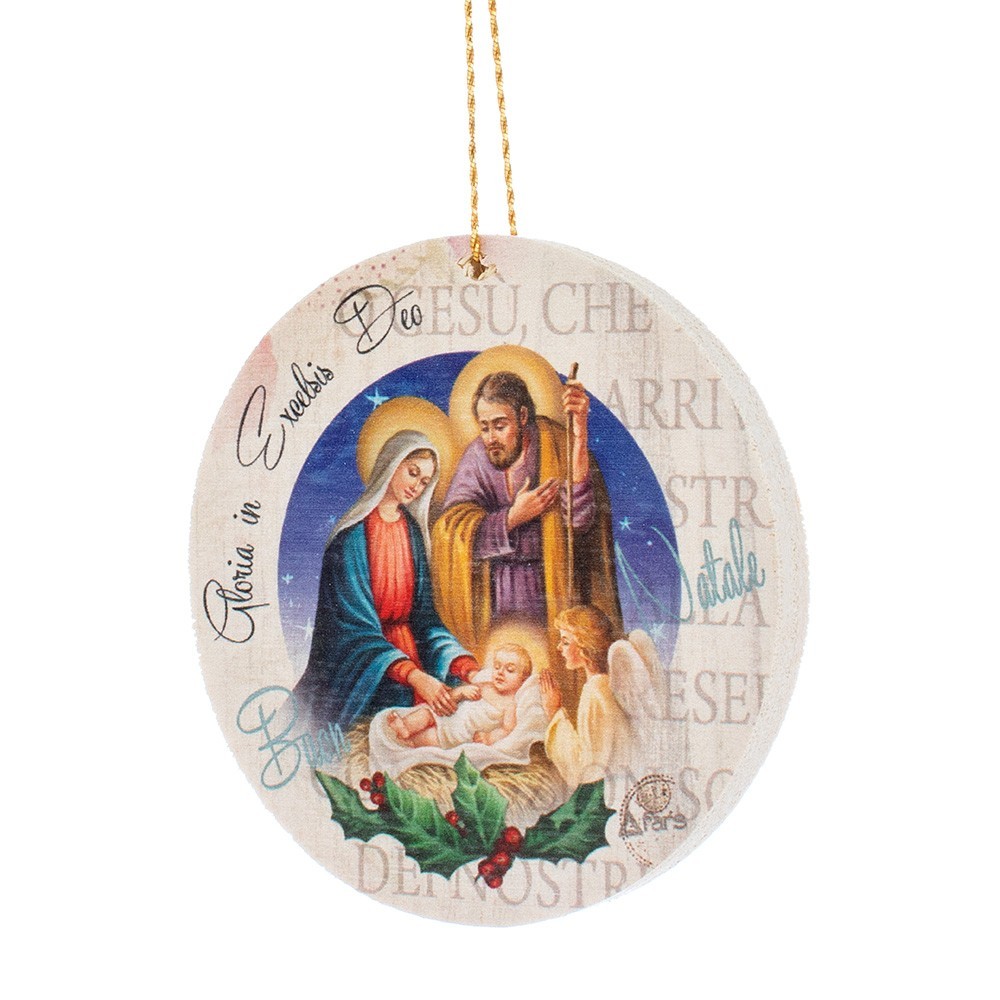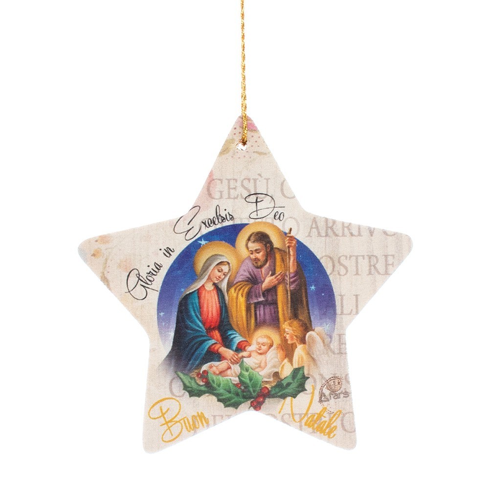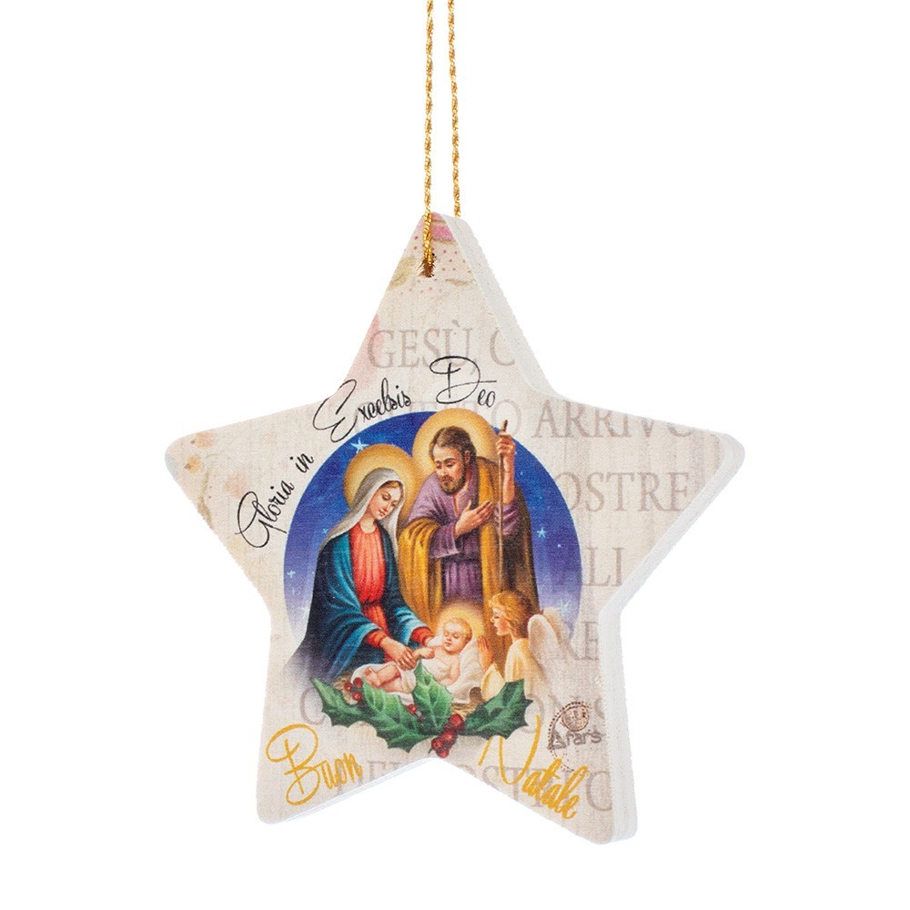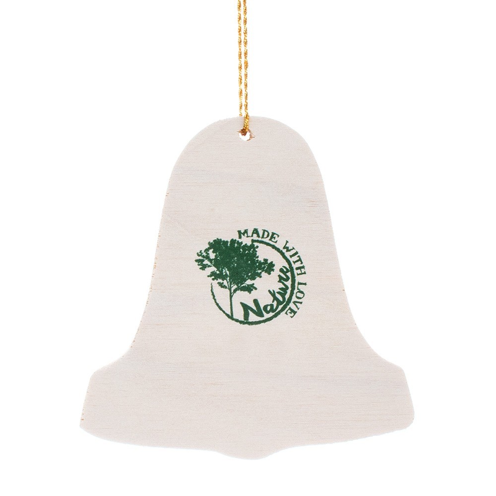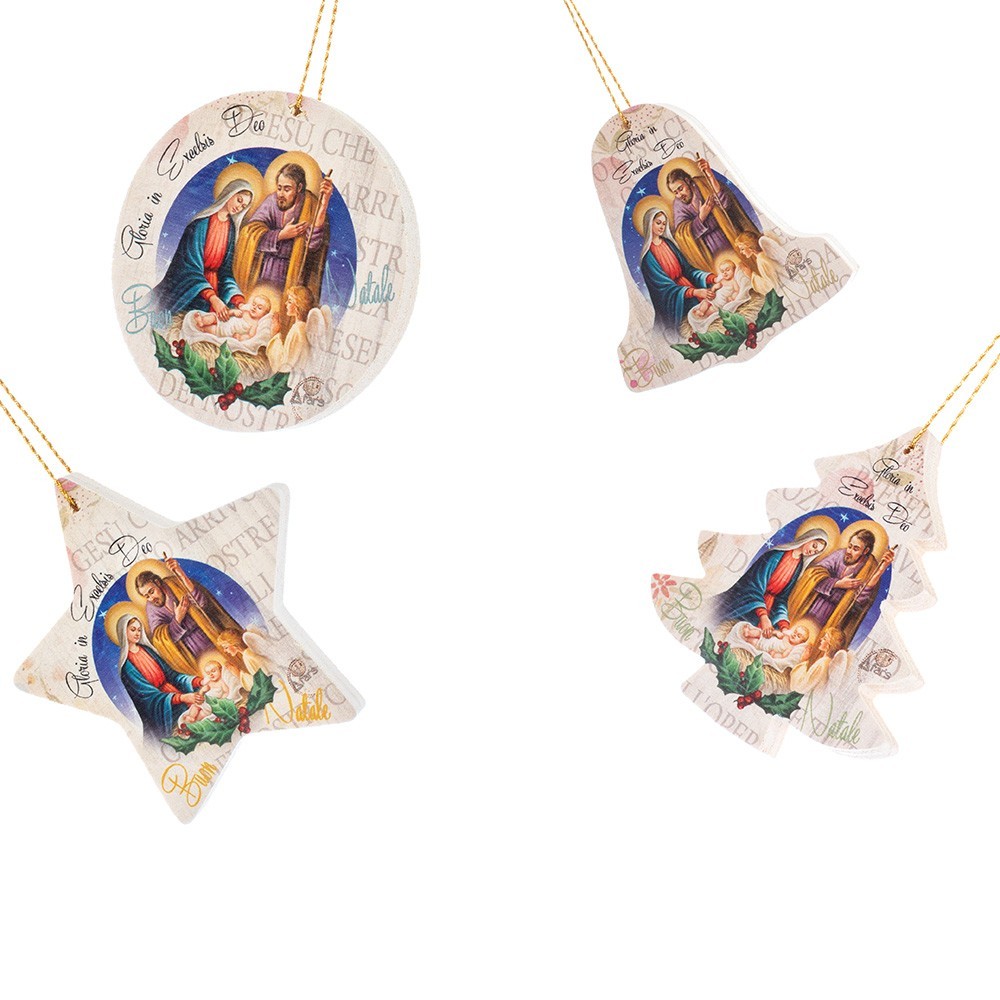 Decoro in legno per albero di natale. Queste graziose decorazioni si presentano in quattro forme assortite (tonda, stella, campana e alberello). Ogni decoro è imbustato singolarmente con all'interno un bigliettino augurale.