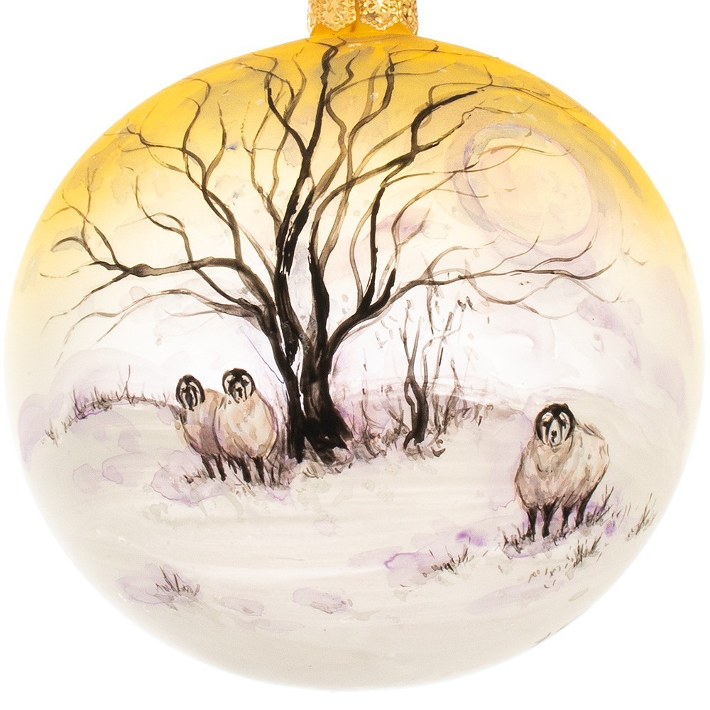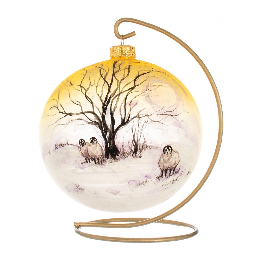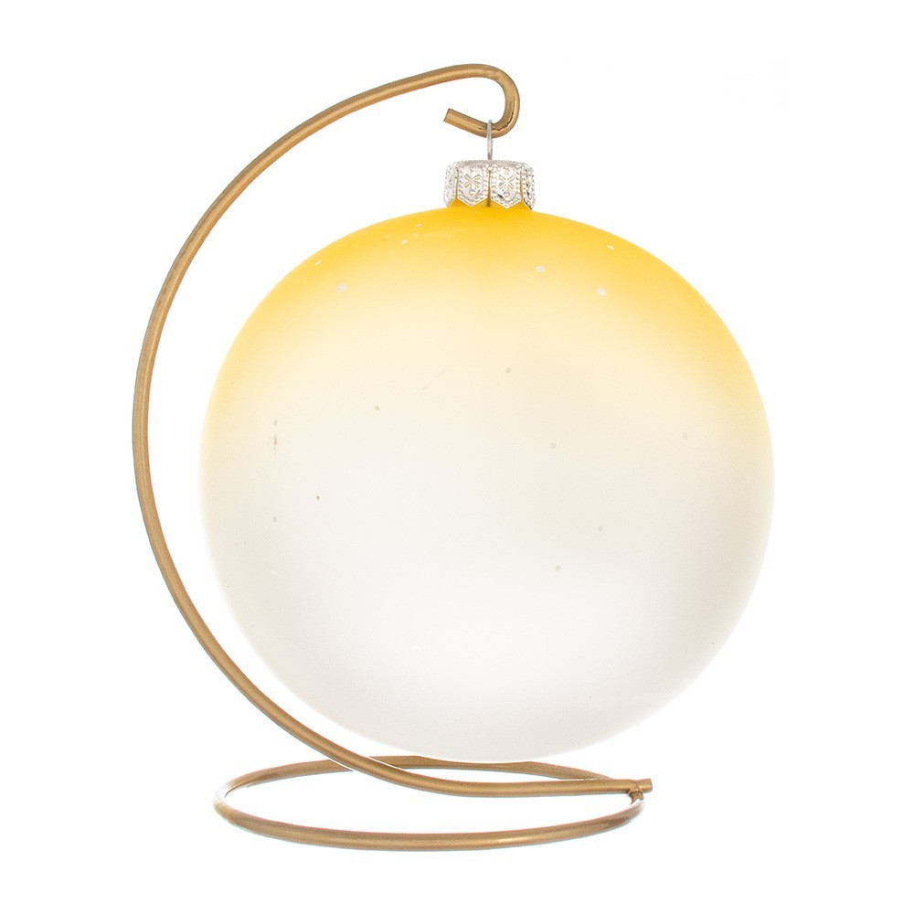 Addobbo sfera di natale in vetro soffiato color oro. Dipinta finemente a mano. La pallina misura 10 cm di diametro. Un regalo ideale per il natale. Confezionata in scatola di cartone marrone.