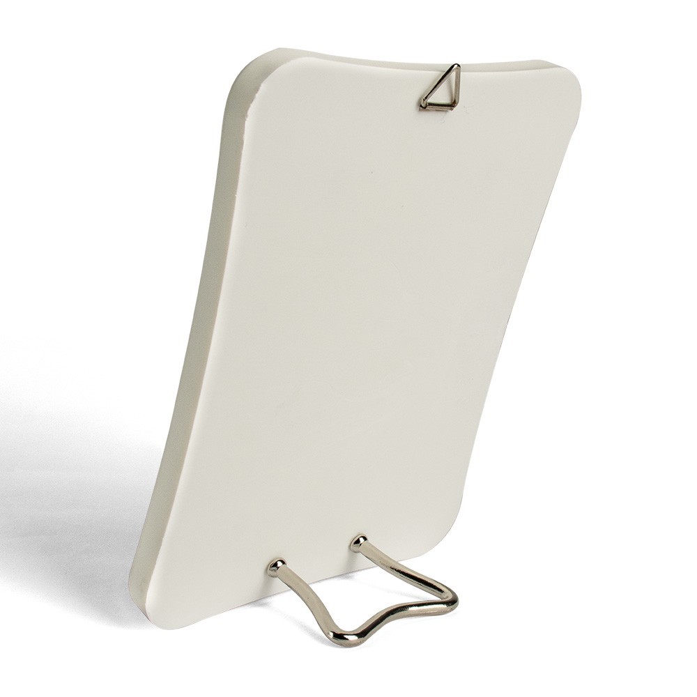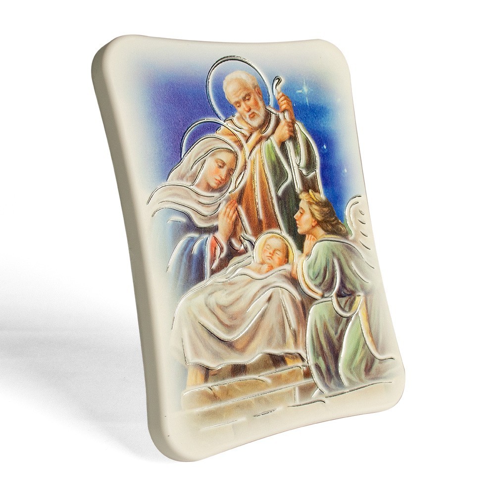 Quadretto effetto pietra con Natività. Questo quadretto può essere sia appeso che d'appoggio (dotato di piedino in metallo) rappresentante una natività raccolta in preghiera con un angelo custode. L'immagine della natività è stampata ed è impreziosita con dettagli argentati. Il tutto corredato di scatola rigida.