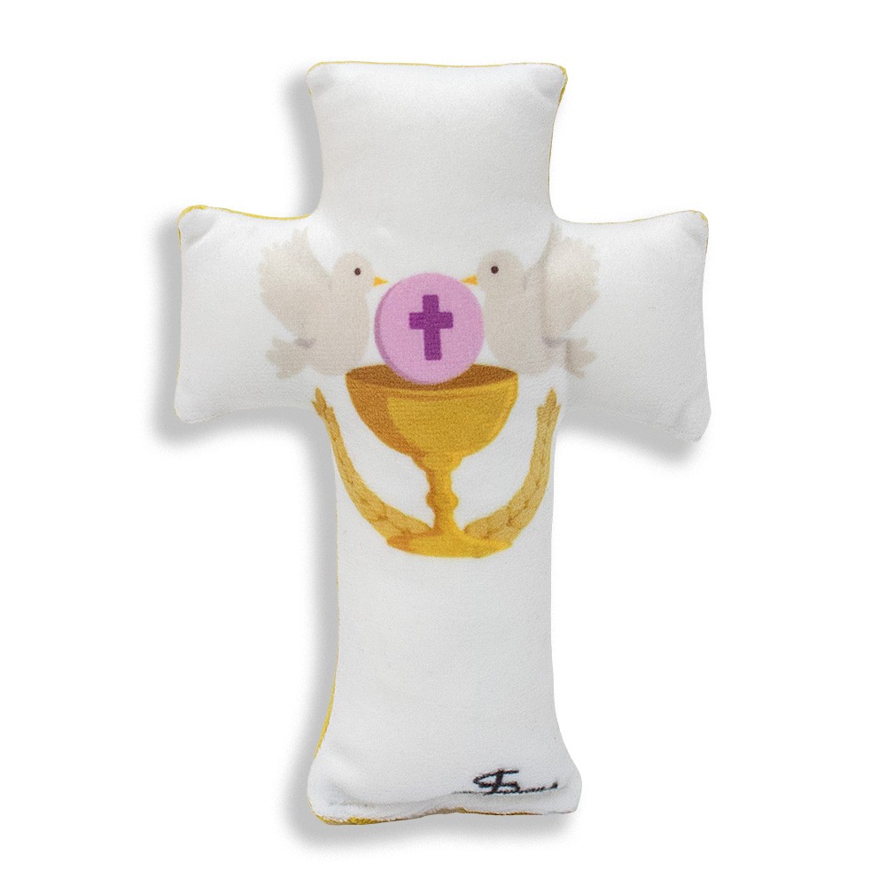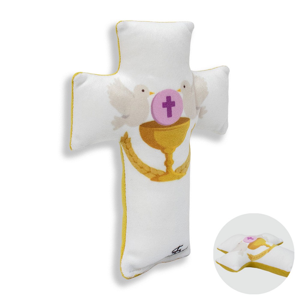 Croce Cuscino STRINGILA completo di imbottitura sintetica e arricchito con simboli eucaristici del sacramento della Prima Comunione.