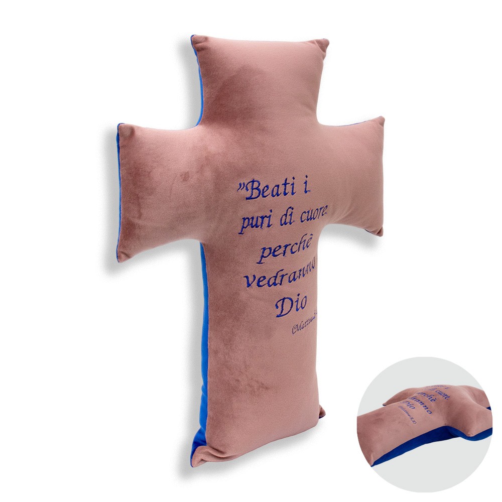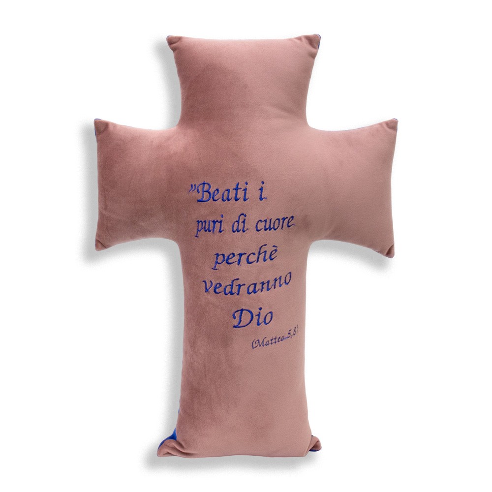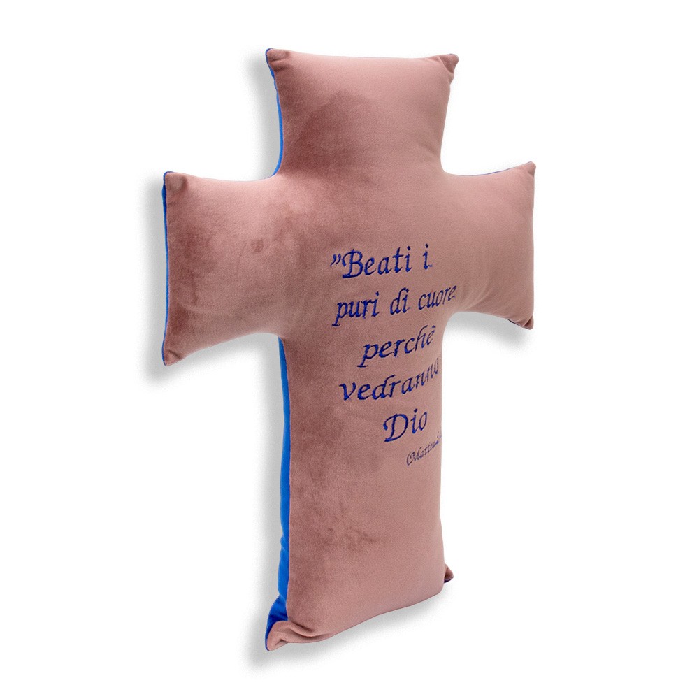 Cuscino a forma di croce della collezione STRINGILA, con frase ricamata a macchina "Beati i puri di cuore perché vedranno Dio".