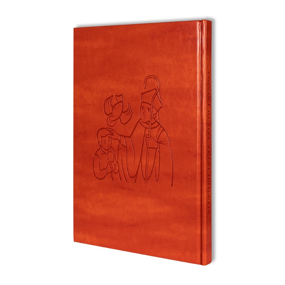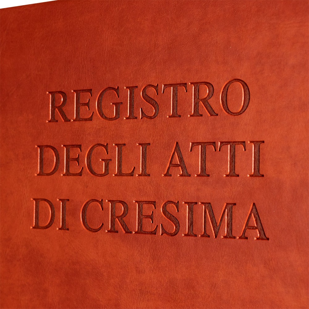 Registro parrocchiale degli ATTI DI CRESIMA. Un valido fascicolo nel quale si registrano tutti i dati del cresimando. Realizzato con copertina cartonata colorata in semlpelle. Il registro è completo di rubrica che consente di riportare i nominativi dei cresimandi e il numero dell'atto corrispondente in modo da facilitare la ricerca.
