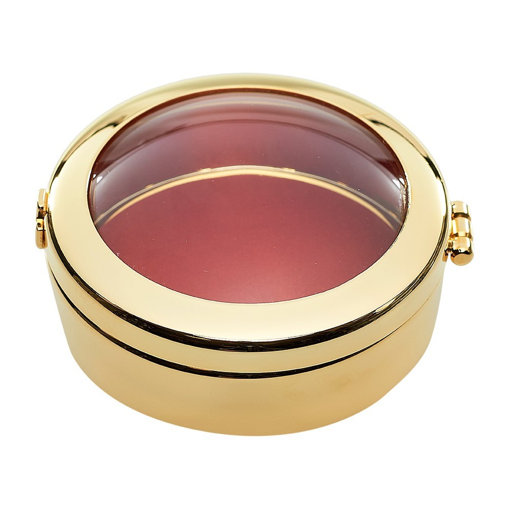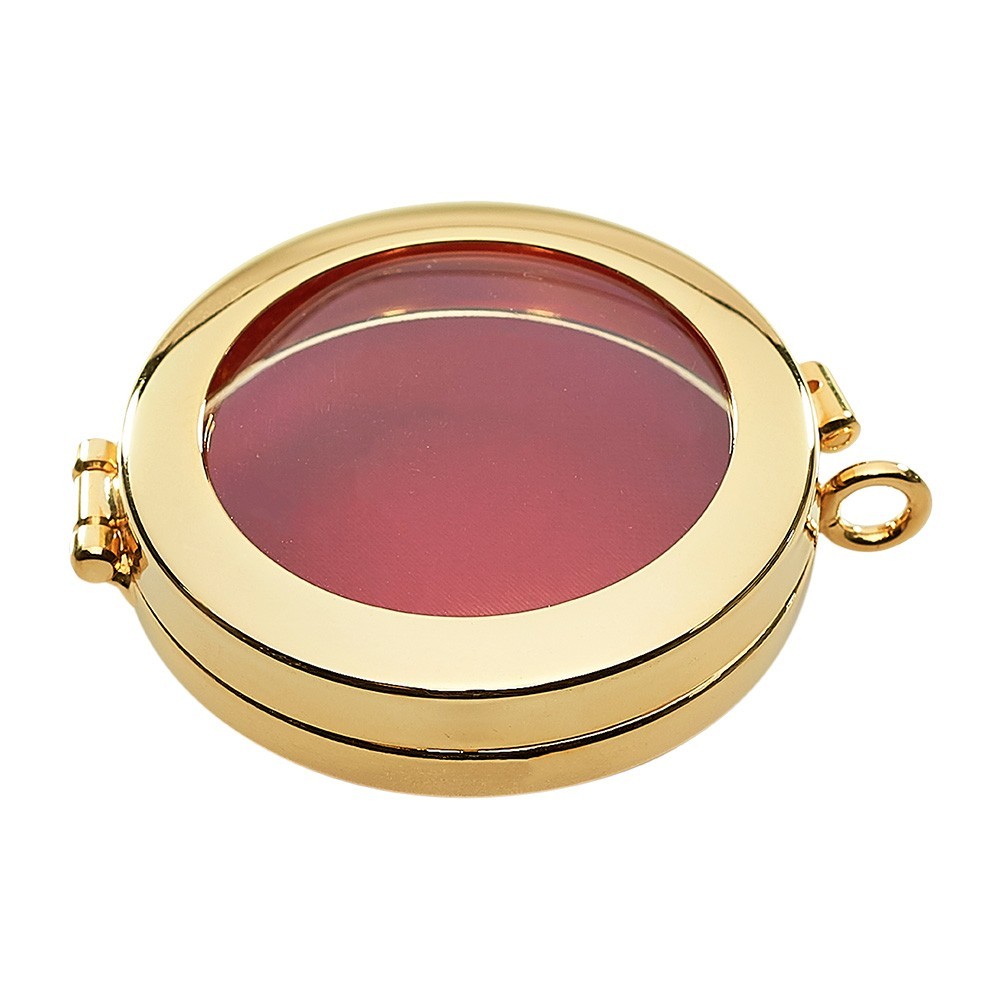 Teca portareliquie semplice di forma tonda realizzata in ottone dorato con fondo rosso. Oblò in vetro. Articolo di produzione italiana.