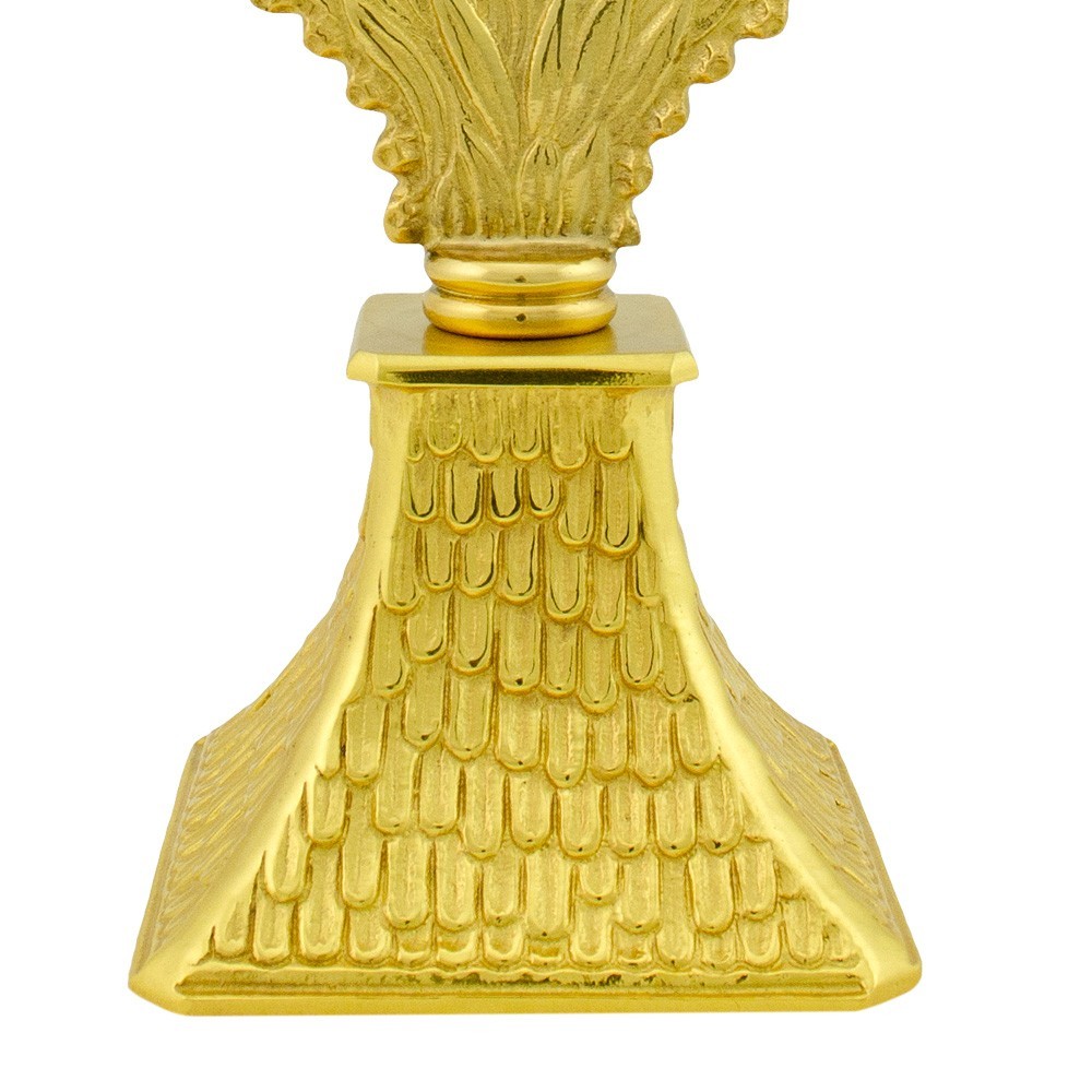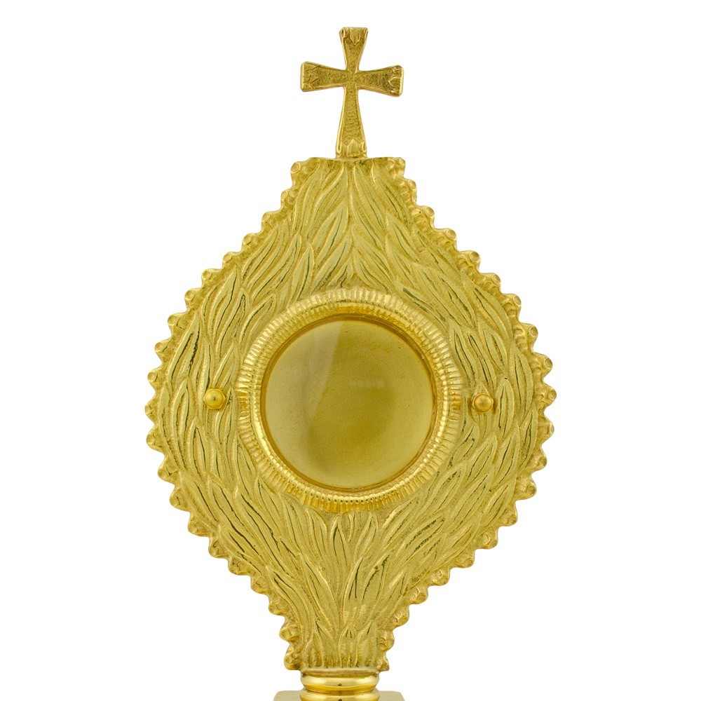 Reliquiario liturgico in fusione di ottone con finitura oro. IL reliquiario è alto 27 cm e il diametro della teca è 6 cm. La teca è finemente decorata con rami di ulivo.