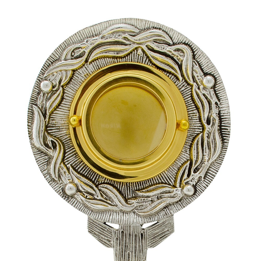 E' realizzato in ottone con ulivi che ornano sia la teca che la base.