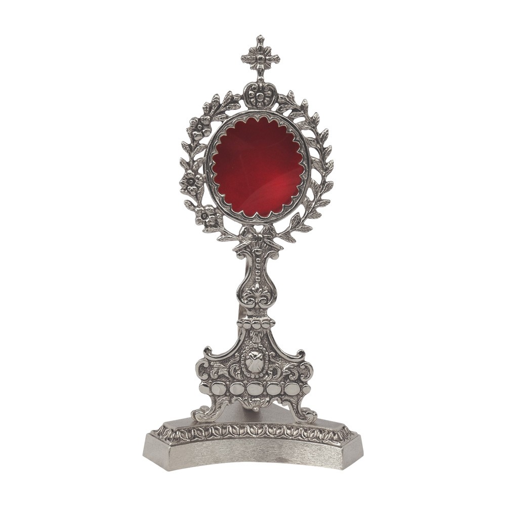 Reliquiario in stile classico con portateca di grandi dimensioni, realizzato interamente in ottone fuso finitura argento.