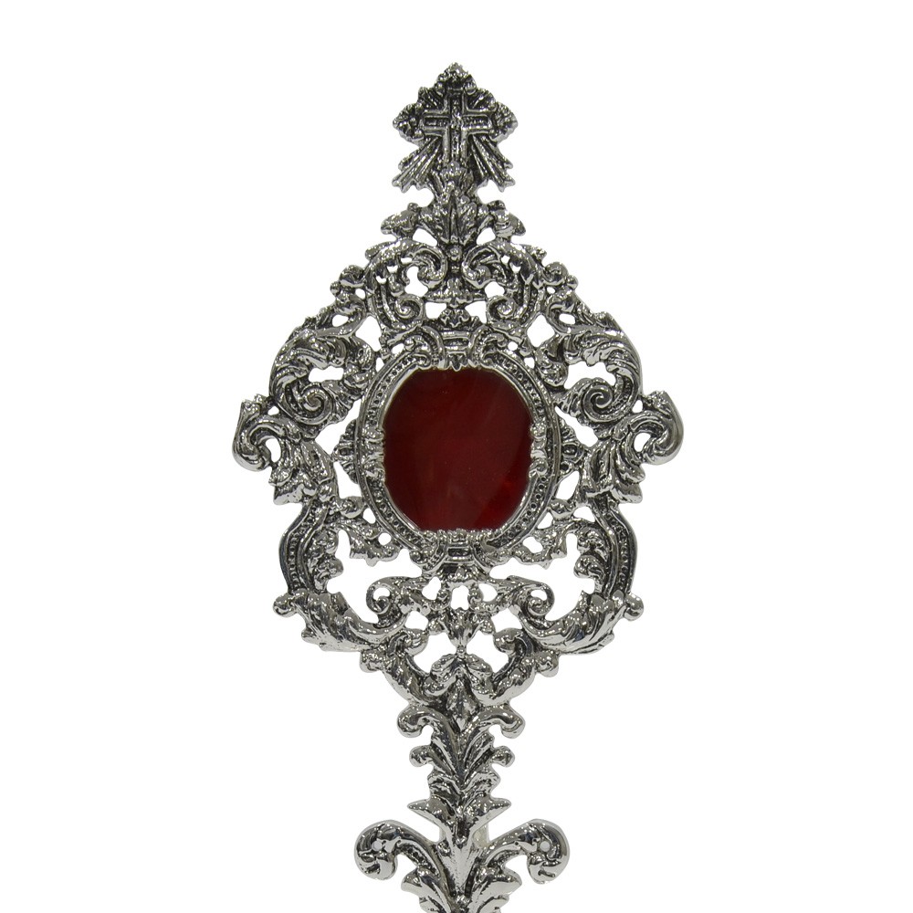 Realizzato completamente in ottone argentato, impreziosito da eleganti e classici decorazioni e piccola croce posta nella parte superiore.