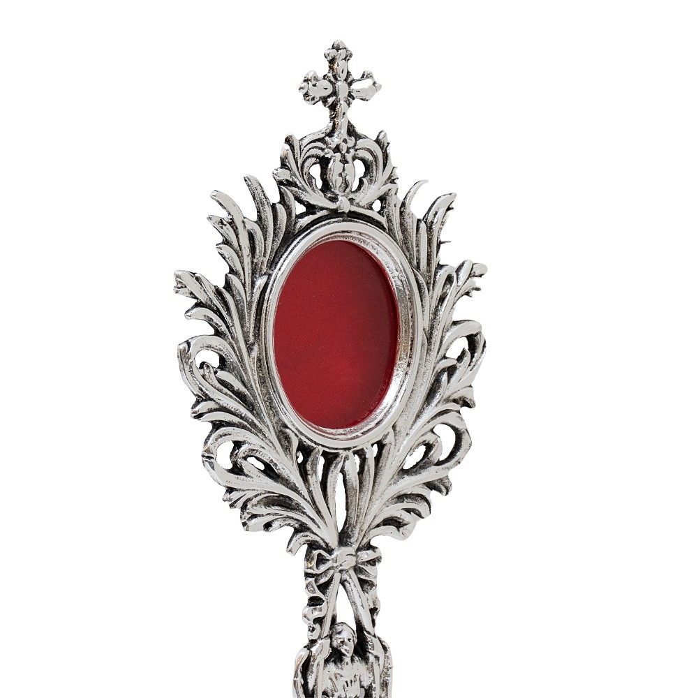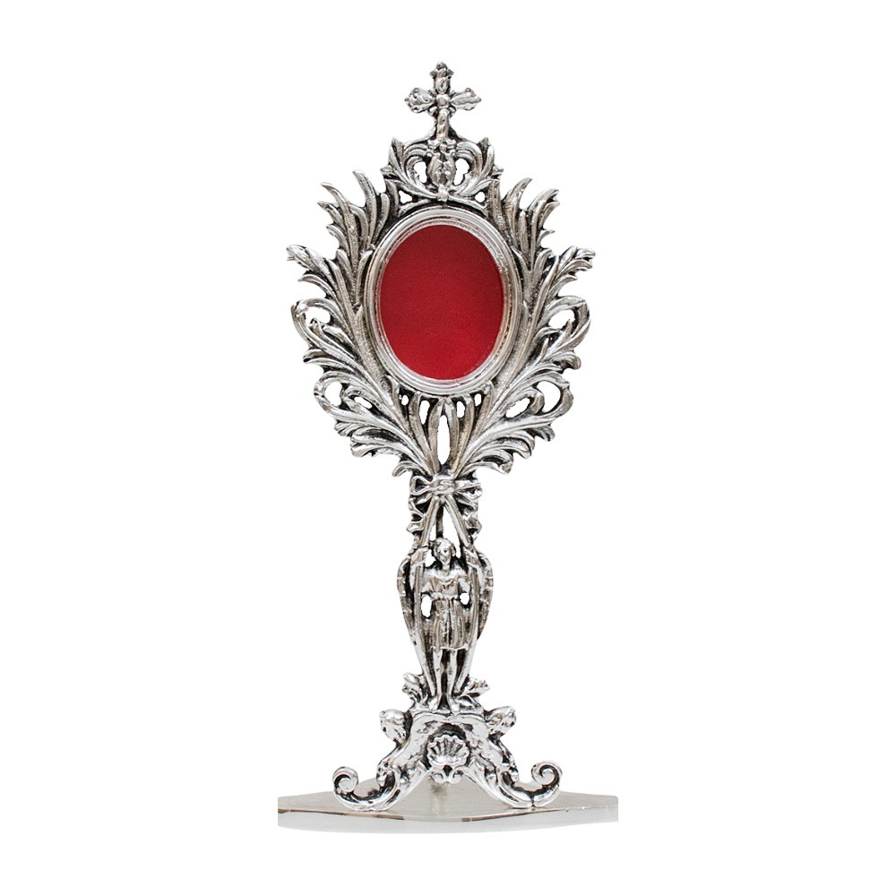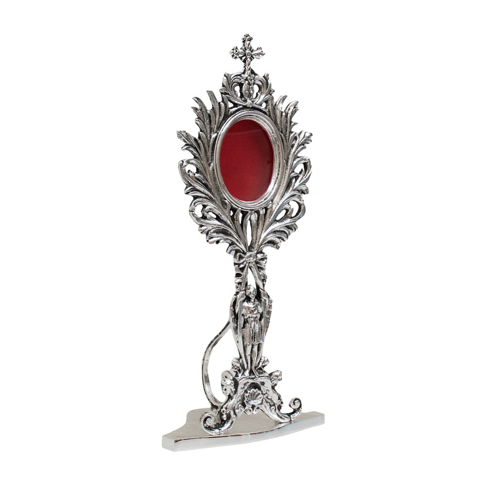 Arredo sacro finemente lavorato, la teca ovale misura 7x5,5 cm, mentre la base 15,5x10 cm.