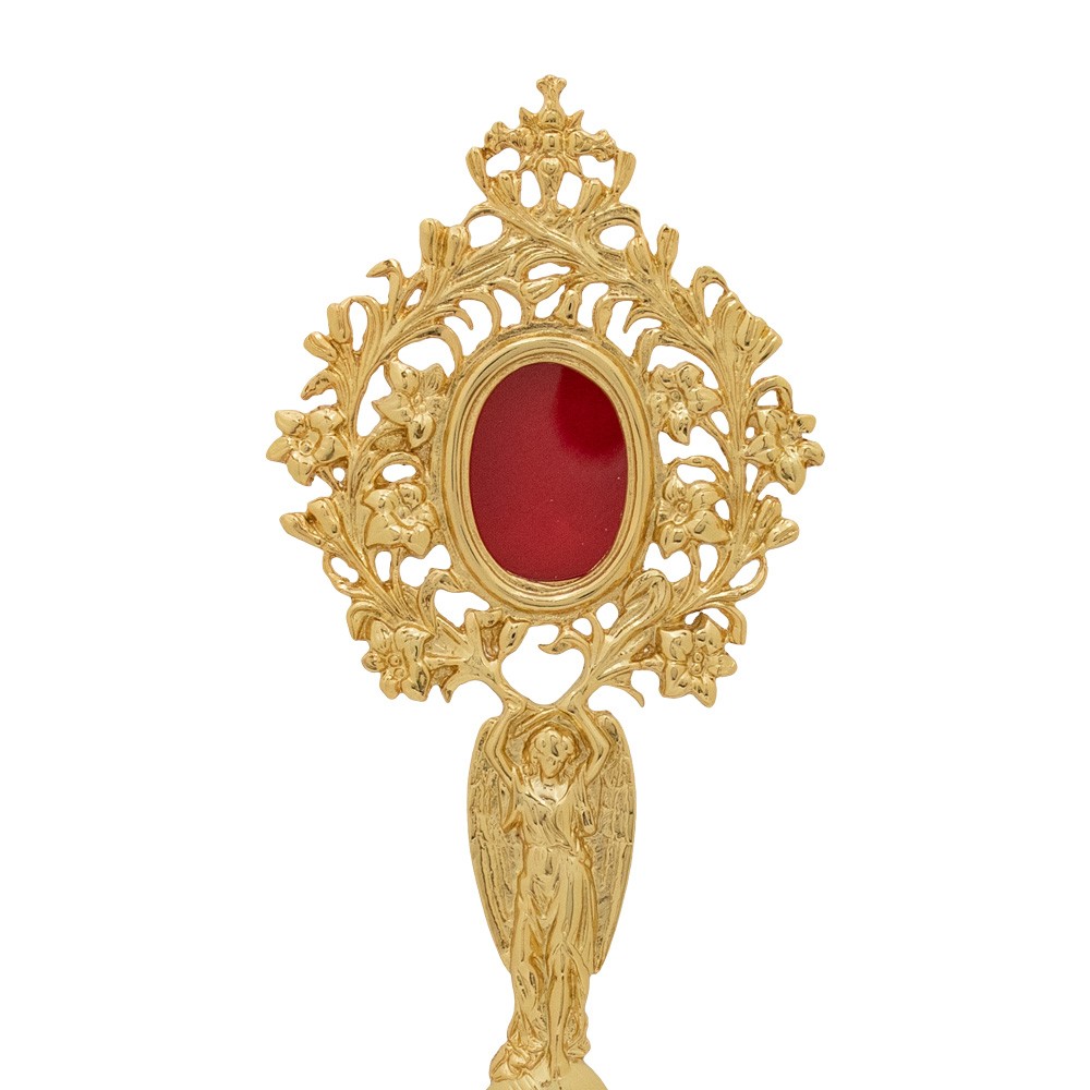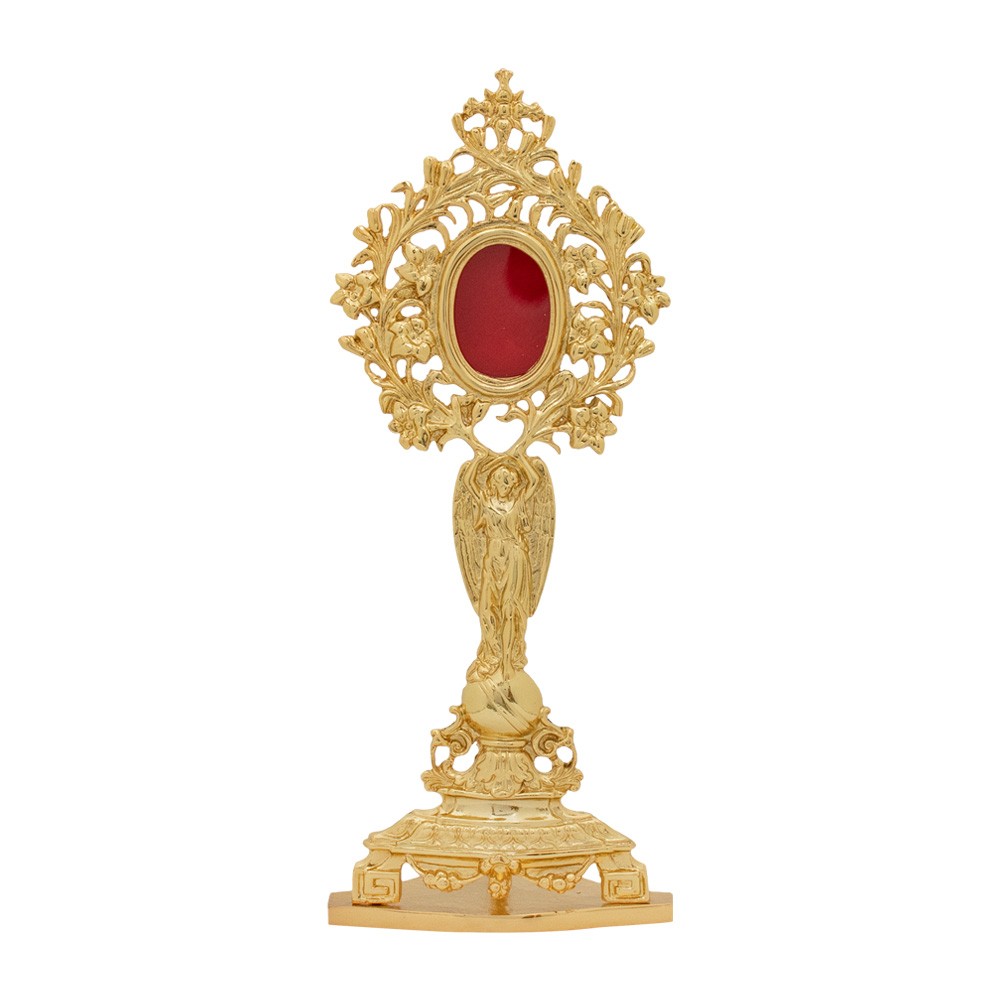 Reliquiario con angelo e fiori realizzato interamente in ottone con finitura dorata.
